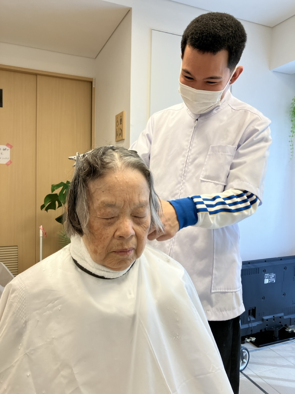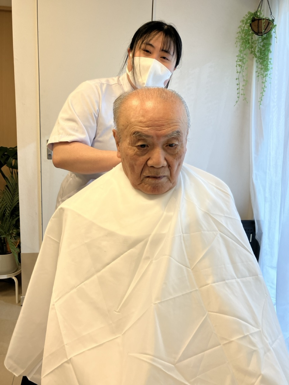 ご利用者様は到着後、水分補給をしバイタル測定後、ヘアカットへと向かいます。