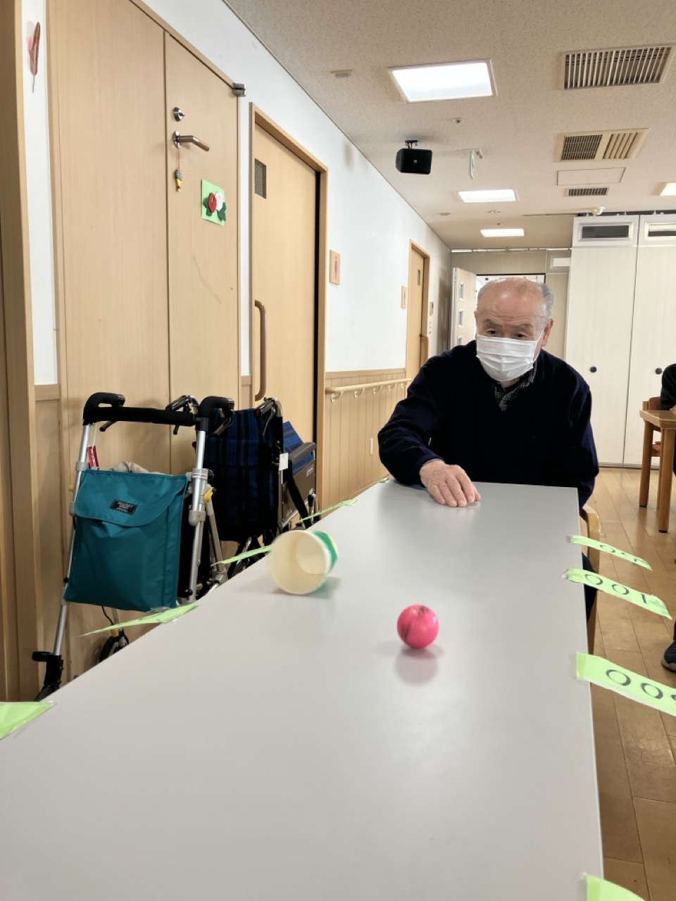 カップの中にゴルフボールを入れてテーブルの上を滑らせるゲームです。