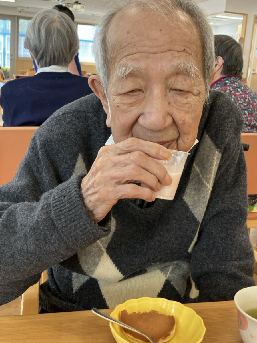 今日のおやつはどら焼きのお供に、ご利用者様に作っていただいた特別メニュー!いちごのフルーチェ♡