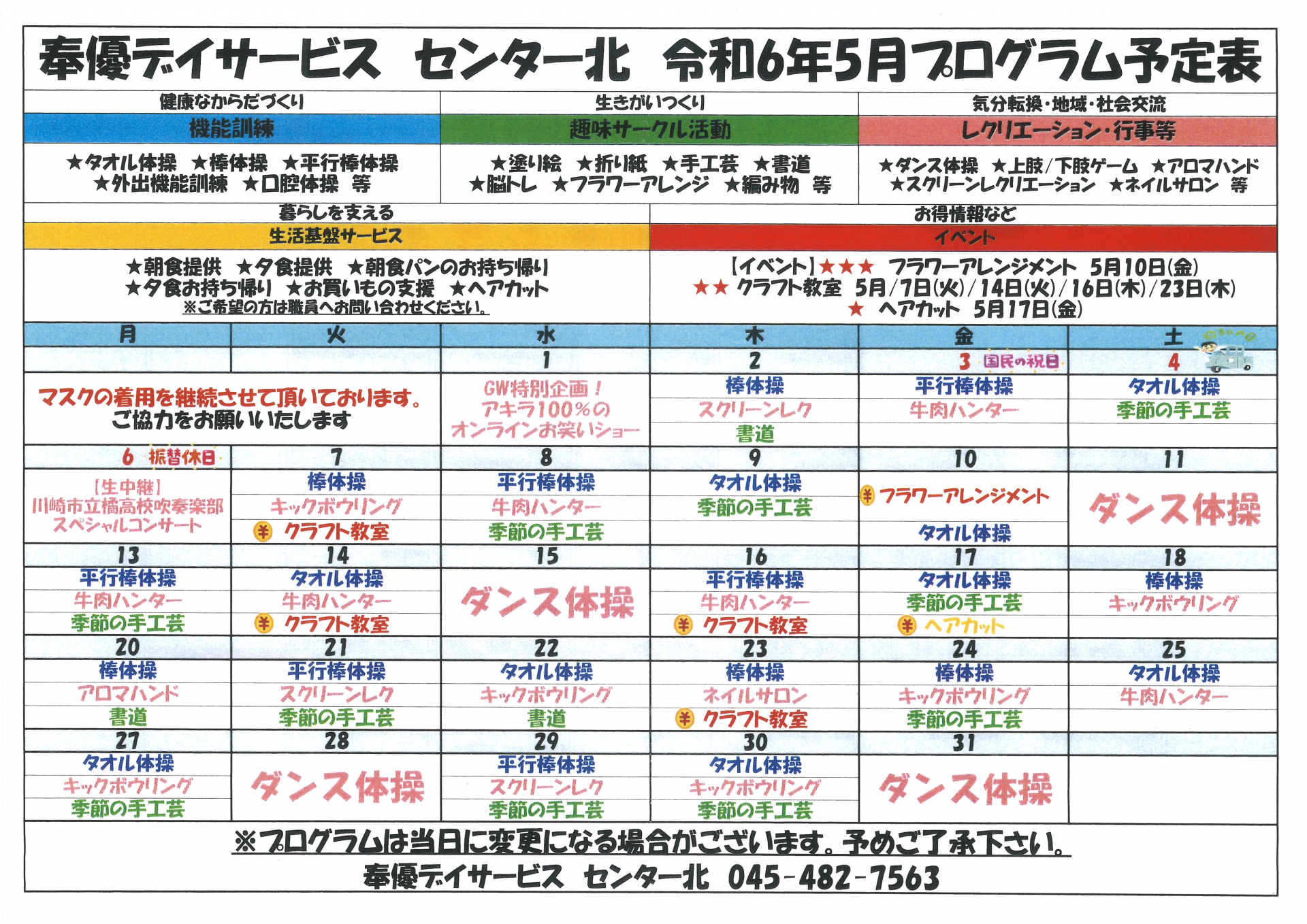 2024.05.02 お知らせ 【センター北】5月のプログラム表です Tweet シェアする 大変遅くなりました。今月のプログラム予定表になります。 お好みのプログラムがありましたら是非ご参加ください。 センター北 周藤 前の記事 2024.05.02 お知らせ 【センター北】5月昼食メニュー 次の記事 2024.05.02 お知らせ 【センター北】5月のイベントは美味しい物♪ 一覧へ戻る