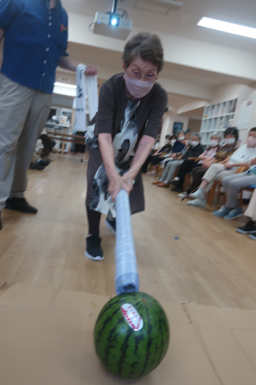 スイカ割りの前に、折角の大玉スイカ(約3㎏)を持ってみたいとの声もあり