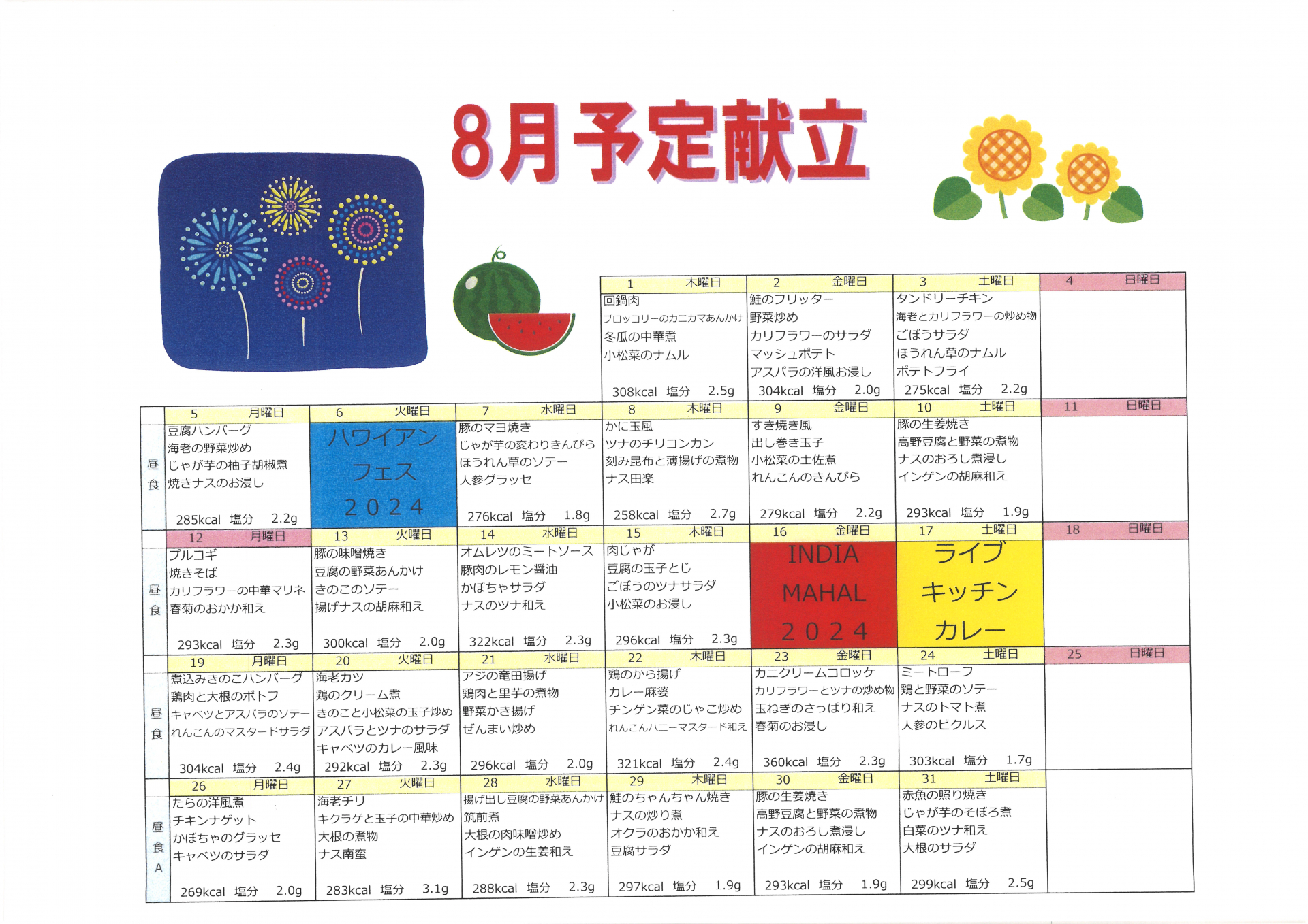 8月のお食事メニューです。