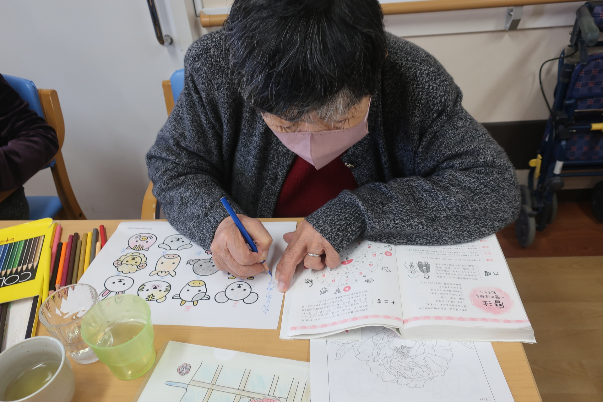 お仲間と談笑されたり、パズルをされたり、塗り絵をされ過ごされております。中でも塗り絵が人気です。お正月や節分などの季節を感じる行事や、風物などを取り入れて楽しんでいただいております。中には、十二支の塗のイラストごとに、十二支の漢字を書いておられるご利用者様がおられ、とても関心させられました。