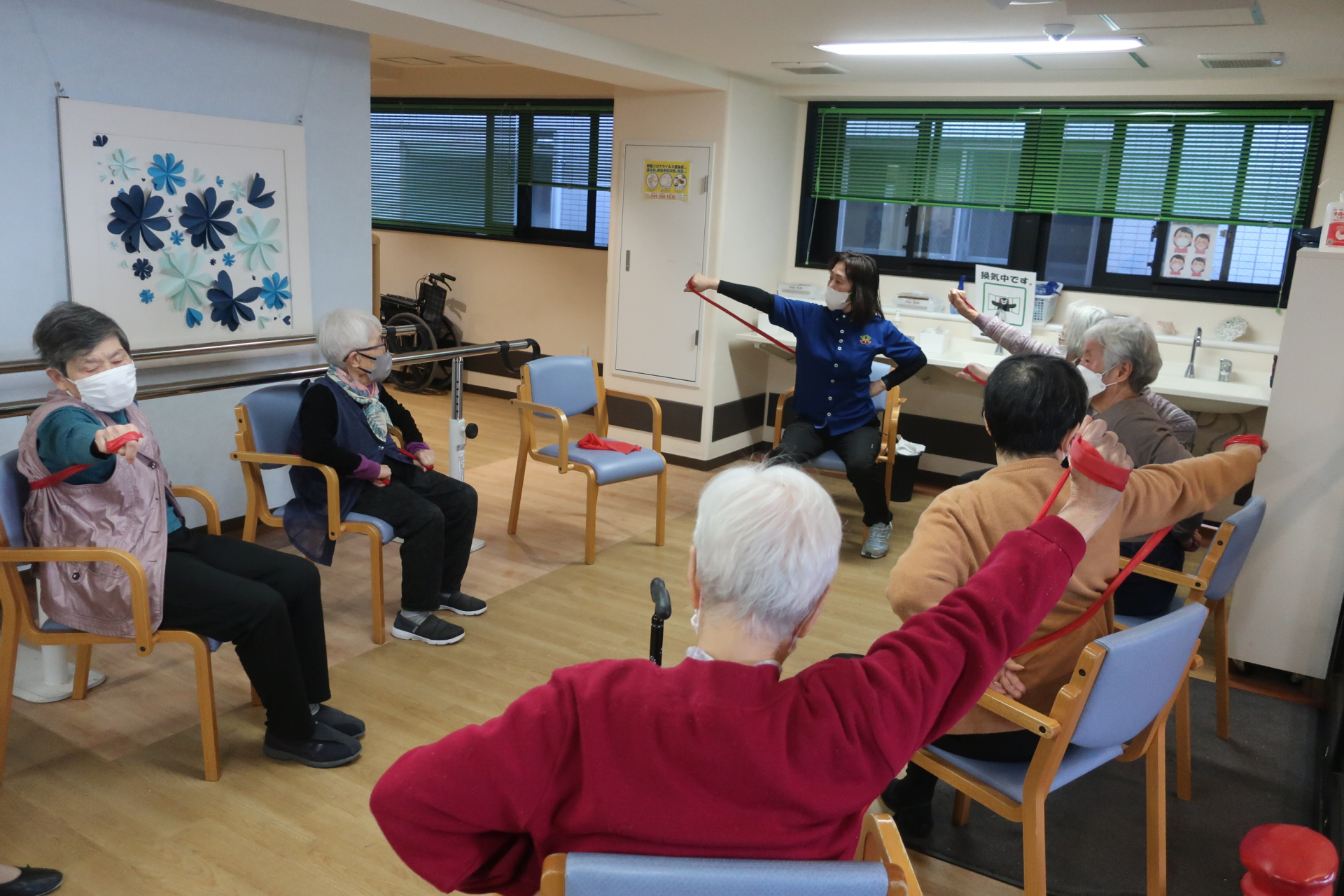 こちらは、セラバンドを使った体操です。皆さんで数を数えながらお体を動かされております。