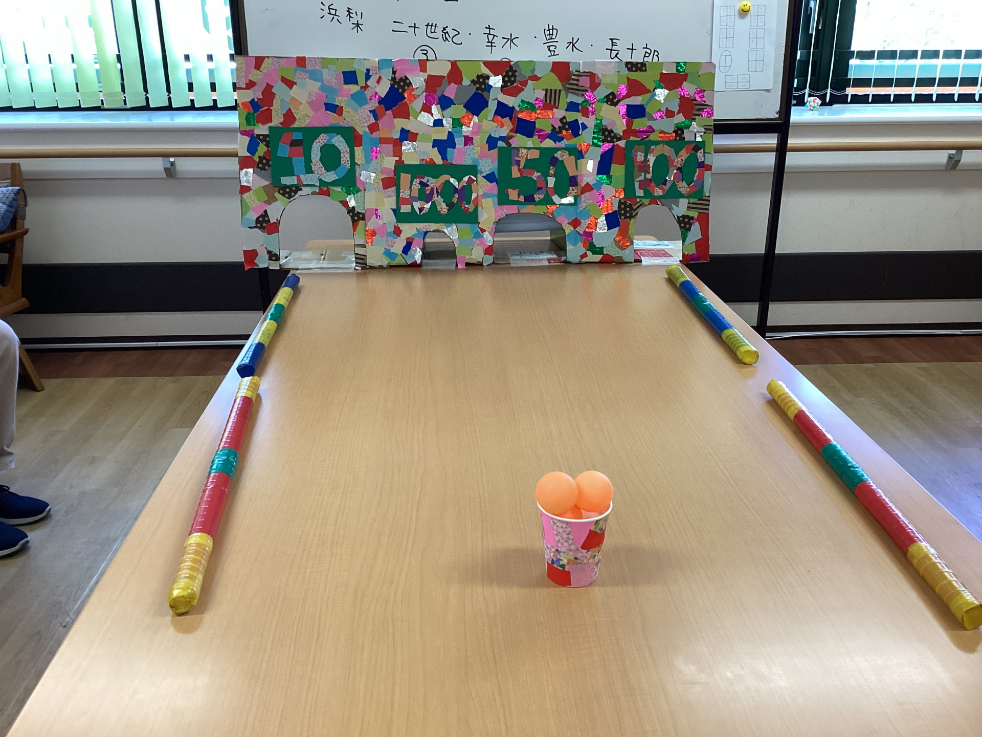 点数毎に穴の開けられた得点表を机の端に置き、ゲーム参加者には、得点表と反対側の端に座って頂き、そこからピンポンのボールをうちわで煽いで、得点表の穴にボールを潜らせて高得点を競って頂くゲームとなります。