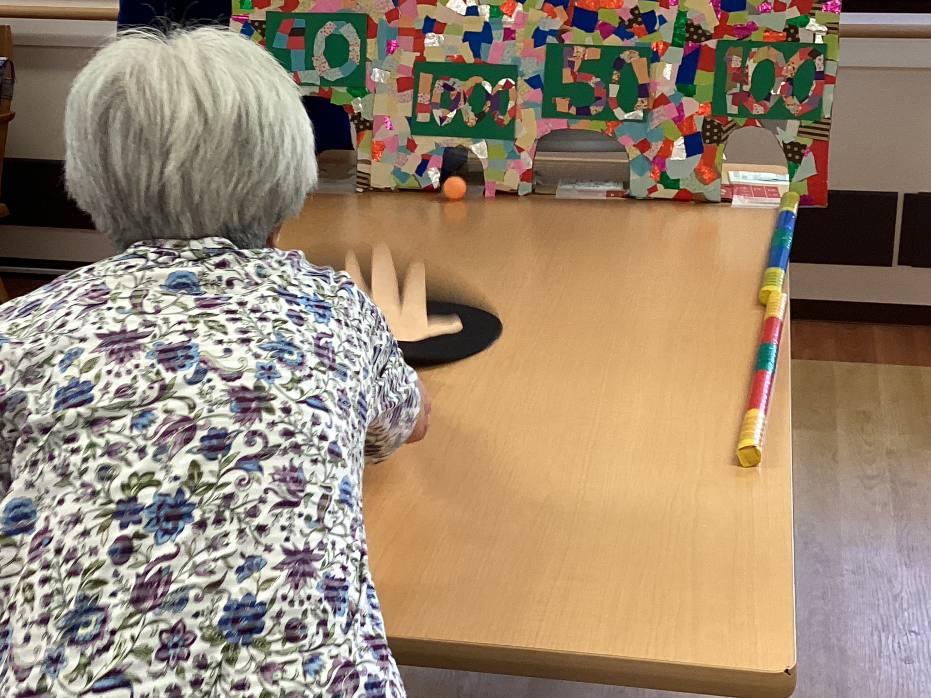 ピンポンのボールをうちわで煽ぐ事による上肢の筋力向上、どの様に煽いだら高い点数の穴にボールを潜らせる事が出来るのか考えて、それを手に伝えてうちわを煽ぐという頭と手の連動による脳のトレーニング、ゲームに参加する事による他者とのコミュニケーションを目的としています。