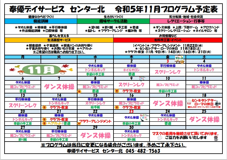 2023.11.08 活動報告 【センター北デイ】令和5年11月プログラム表 Tweet シェアする 令和5年11月プログラム表★ 奉優デイサービスセンター北 大平 前の記事 2023.11.10 活動報告 【センター北デイ】折り紙を貼付けていただきました! 次の記事 2023.11.04 活動報告 【センター北デイ】令和5年デイ新聞10月号 一覧へ戻る