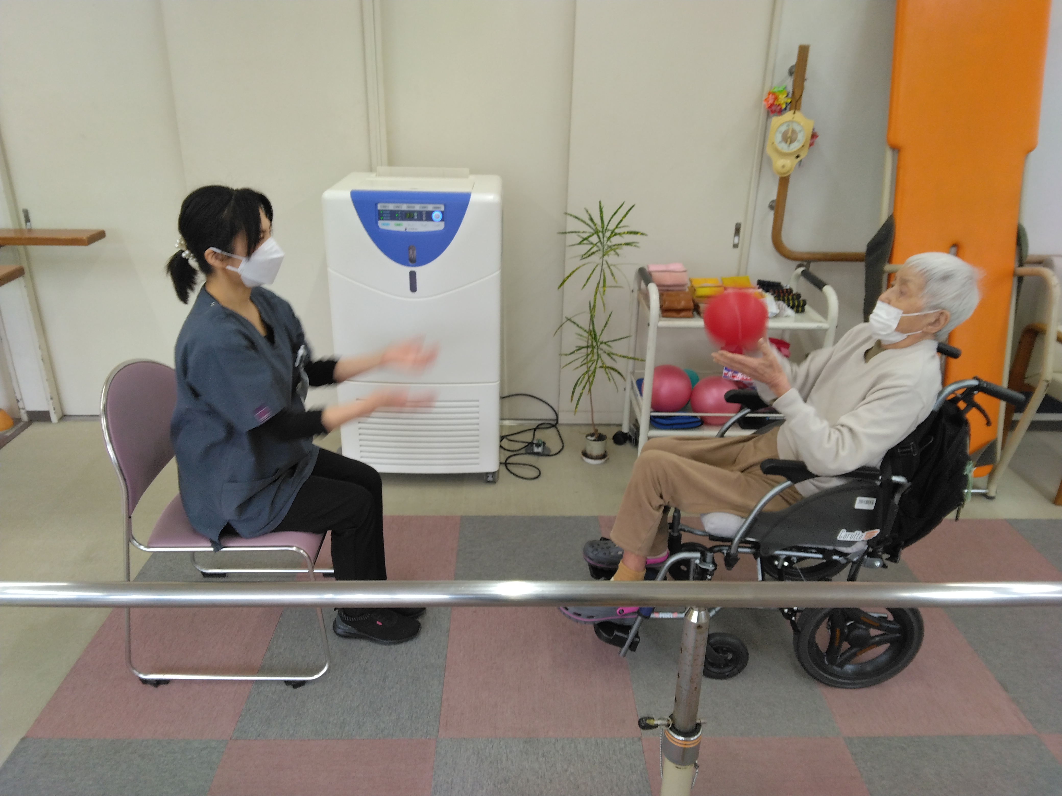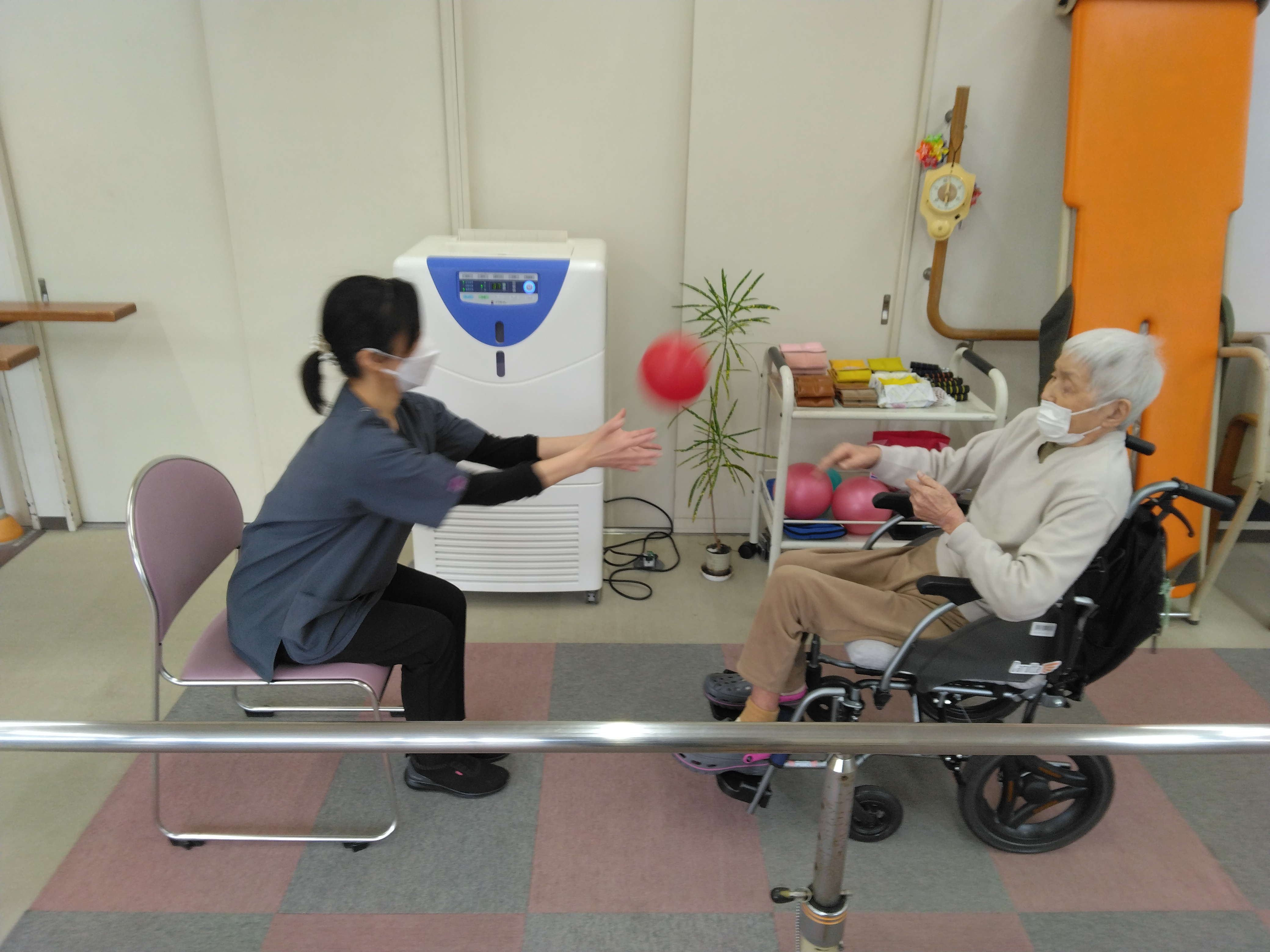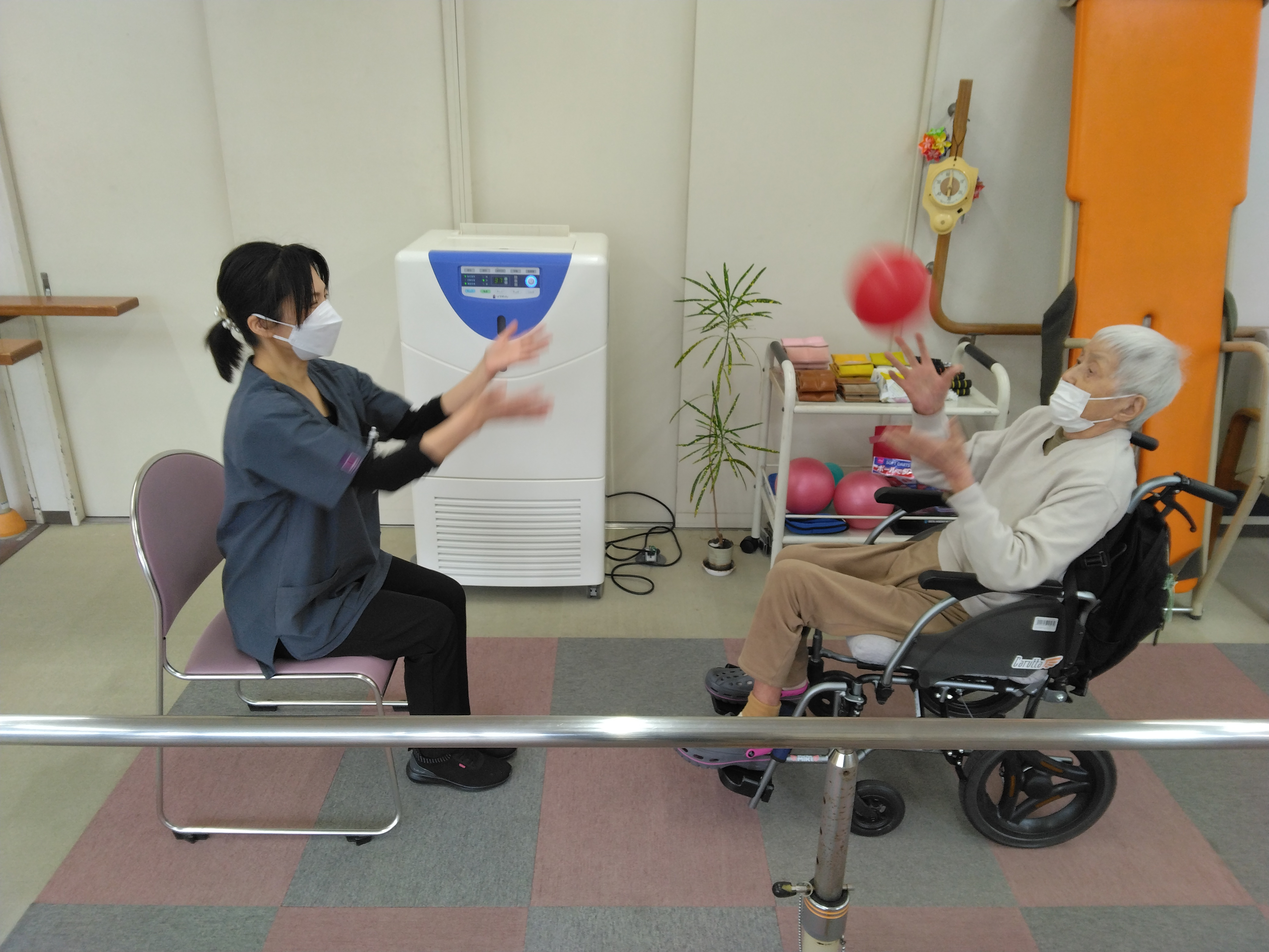 【枝川デイ】【機能訓練】Tさまのボールを使った上肢運動(岩)