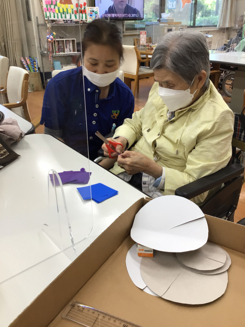 皆様 こんにちは。本日はリラックスタイムでU様は手芸品を作っています。今回はあじさいの花を作っています。リラックスタイムで好きなことをやると良いですね。楽しみながら、手の運動にもなりますね。今日もお疲れ様でした。次回もよろしくお願いいたします。