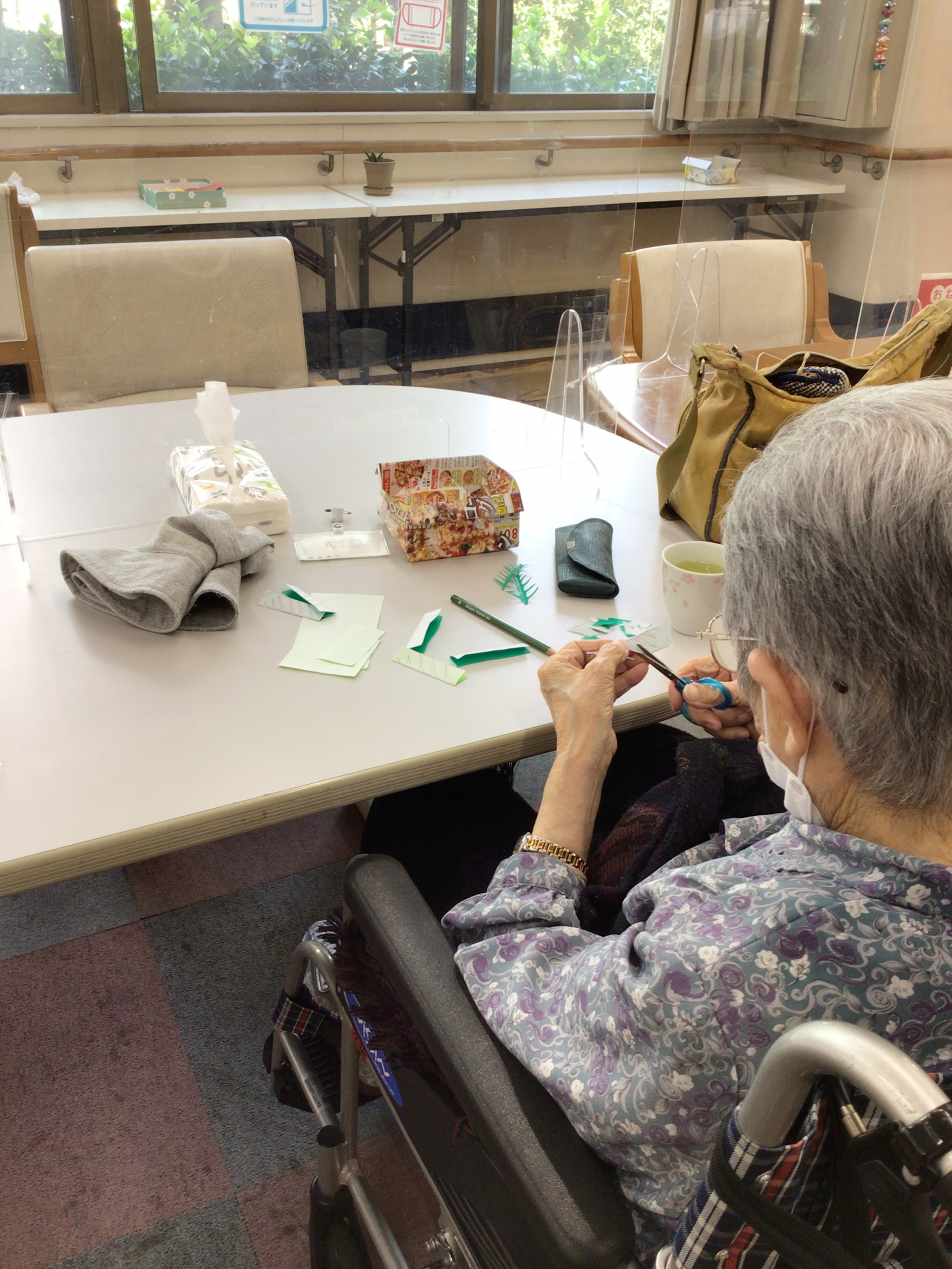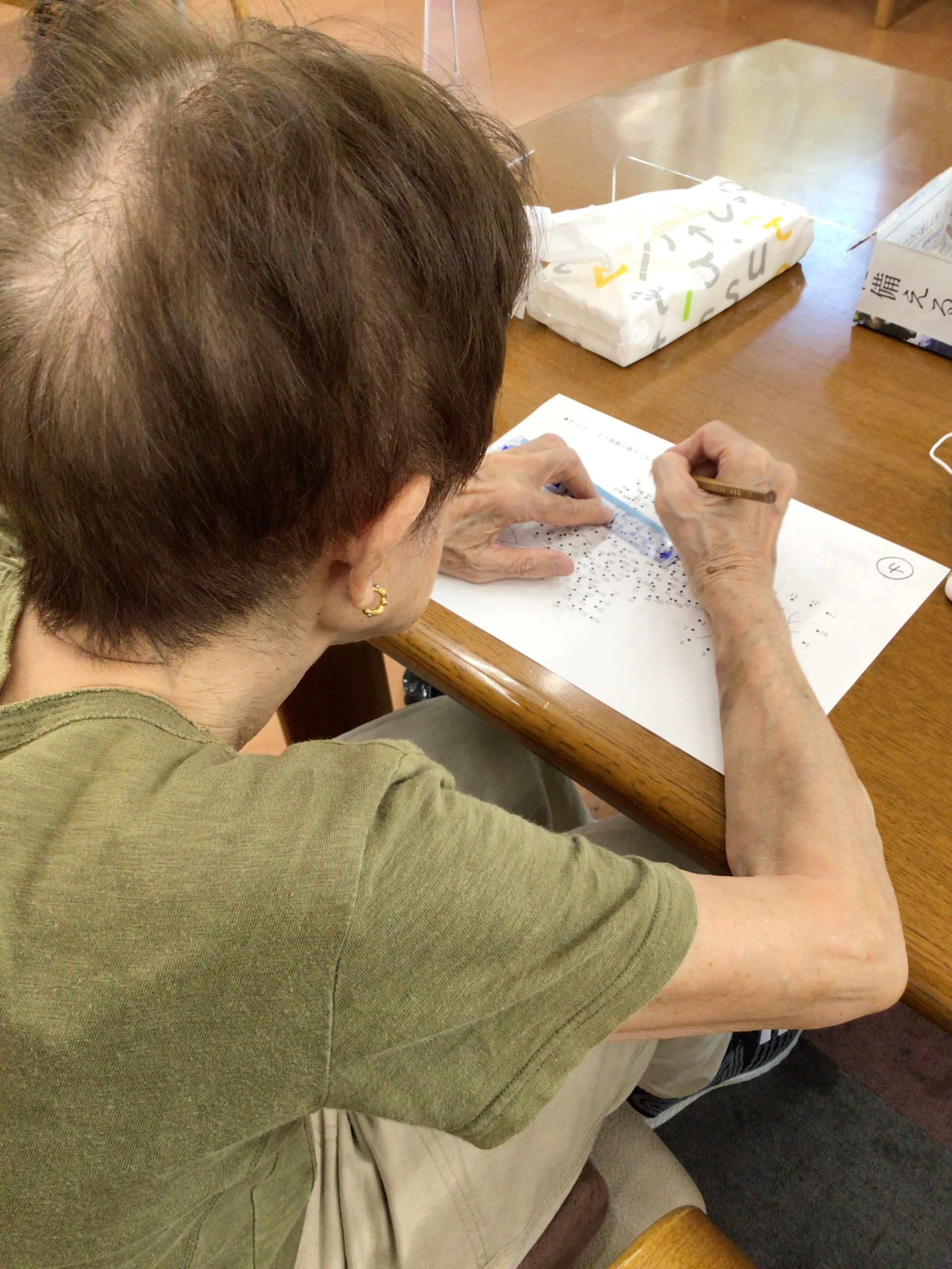 本日の様子の写真をご紹介いたします。朝のプログラムの前に皆様は様々な好きなことをしていらっしゃいました。折り紙で何かを作ったり、新聞を読んだり、つなぎ点をしたりしていらっしゃいました。皆様 今日もお疲れ様でした。