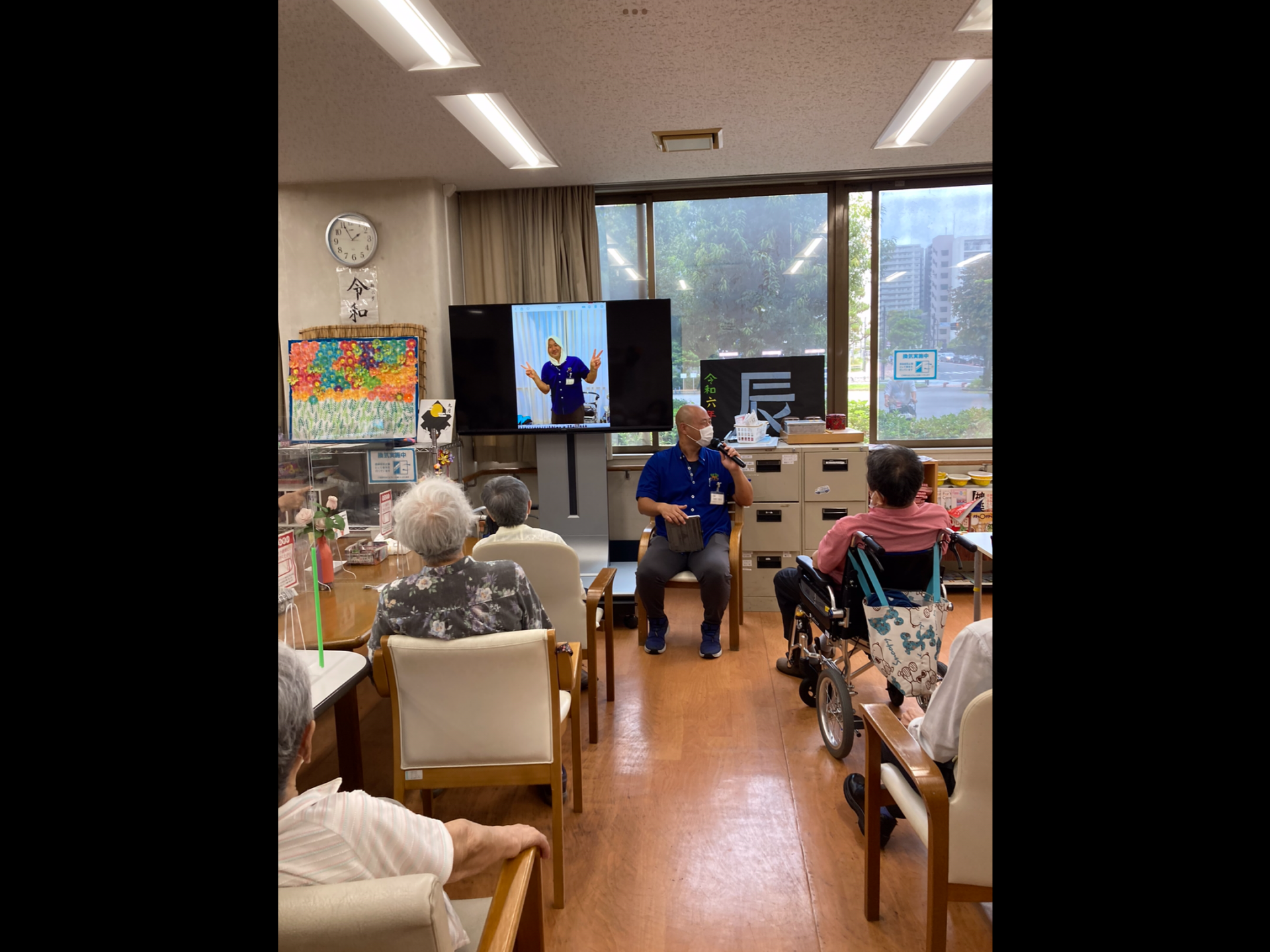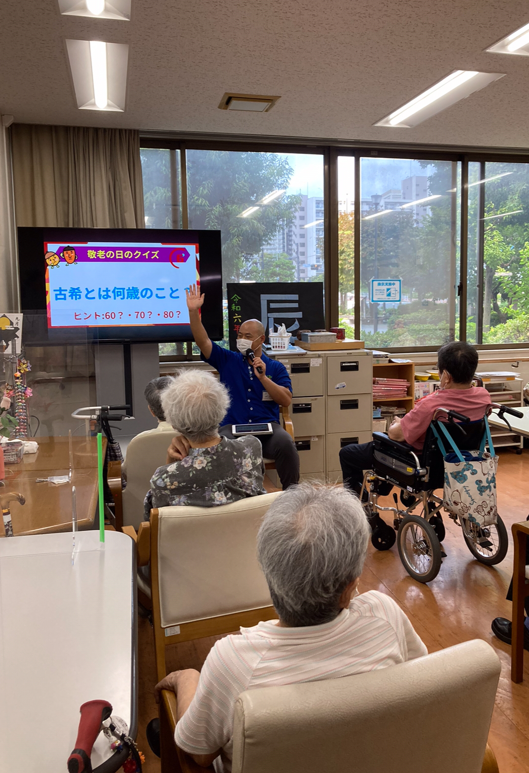 本日、敬老会を行いました。職員の後ろ姿から誰かを当てるゲームなどの出し物や、敬老の日のクイズなどを行いました。皆様に喜んで頂けたなら幸いです。