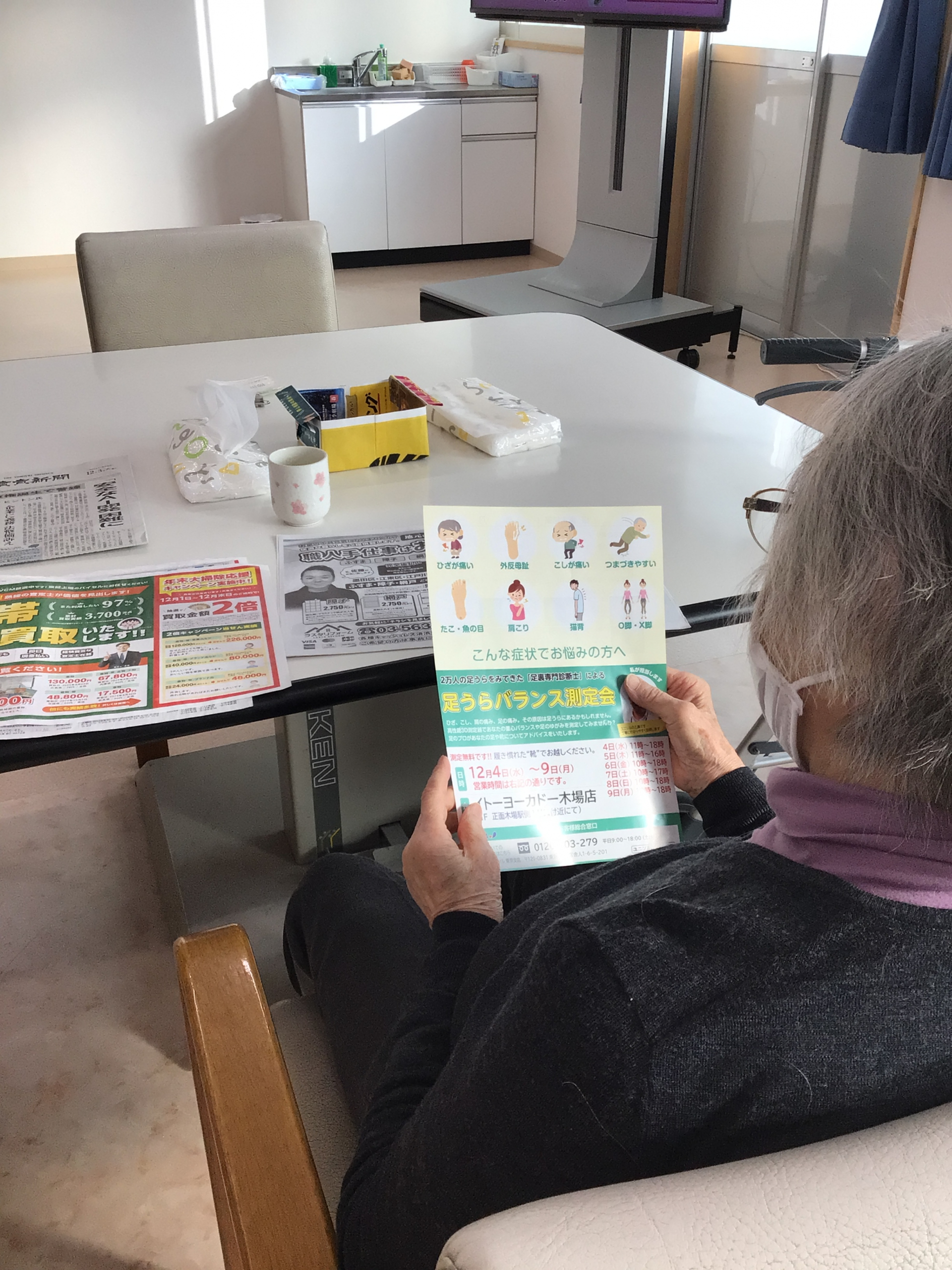 皆様 こんにちは 枝川高齢者在宅サービスセンターです。本日はK様が一番に来られました。プログラムの前に新聞とチラシを読んで過ごされていて、「やっぱり新聞を読むと最近の出来事が解って良いわね」と言われました。K様今日もお疲れ様でした。次回よろしくお願い致します。