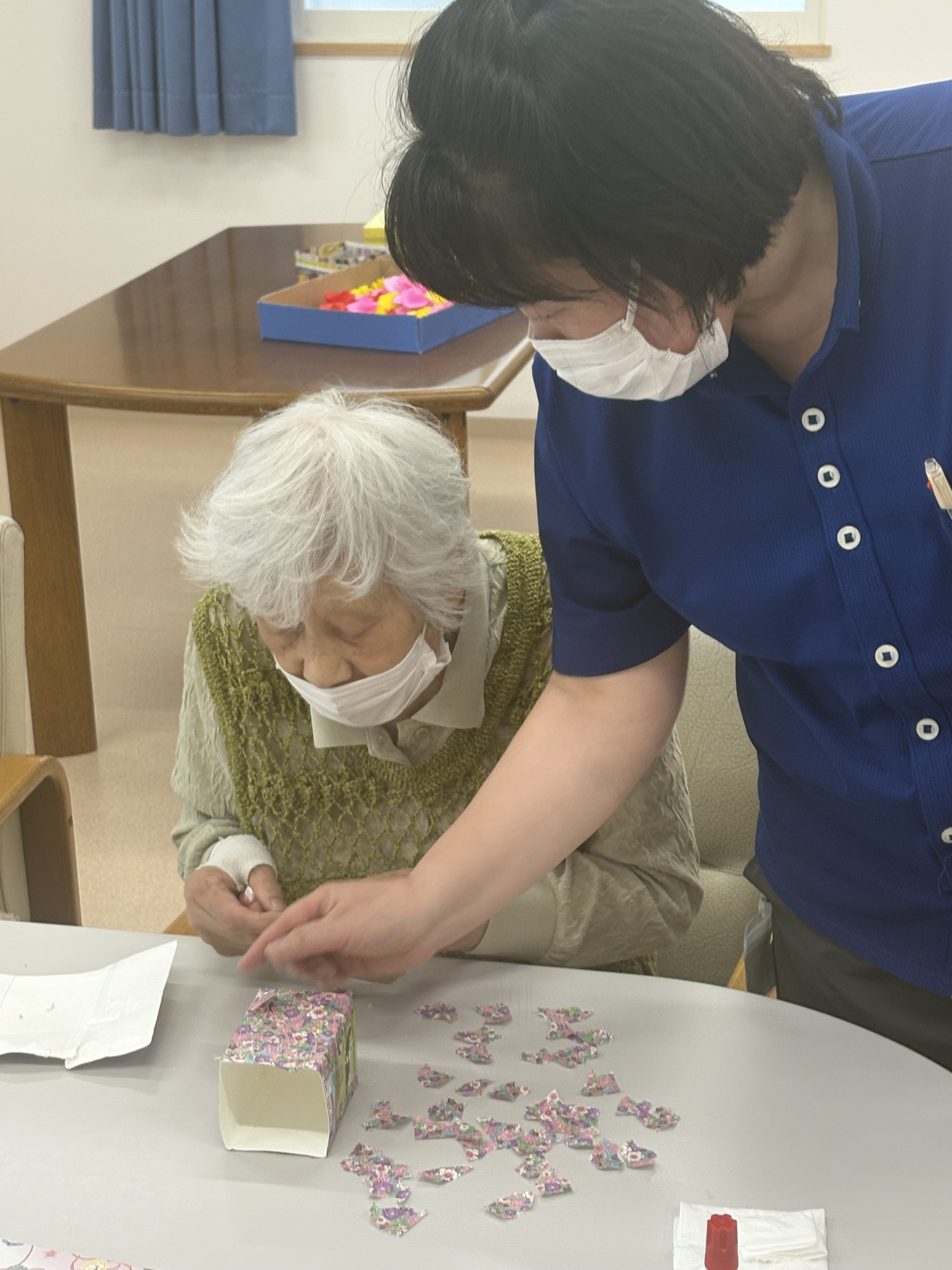 皆様こんにちは!枝川高齢者在宅サービスセンターです。本日のレクのお時間では、牛乳パックを使用したペン立てを皆さんで作りました!