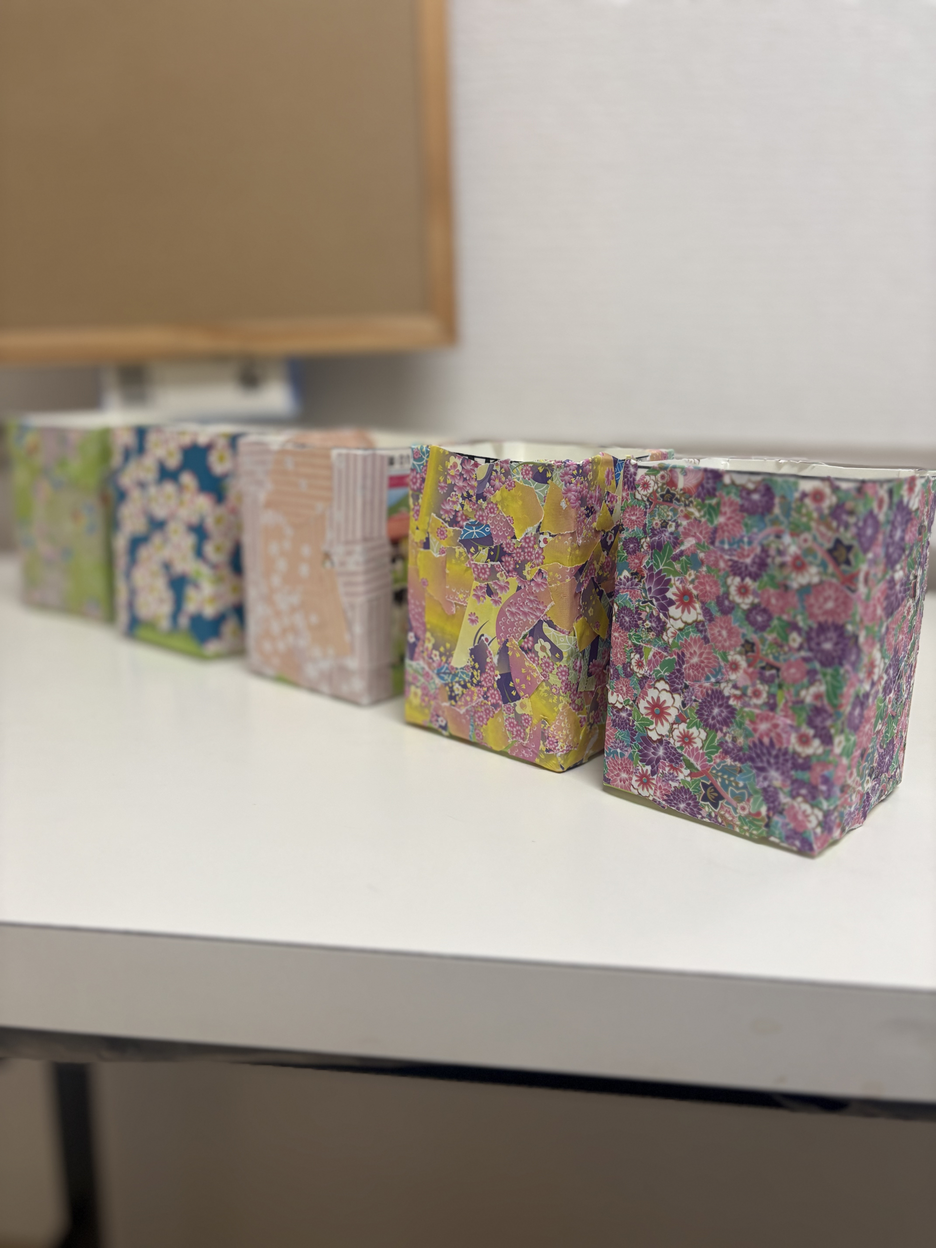 牛乳パックに色鮮やかな折り紙のカットして貼る事で、華やかなペン立てを作りました!皆さんボンドで手がベトベトになりながらも必死に取り組んでおりました!