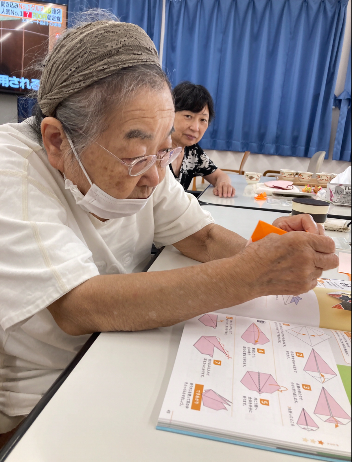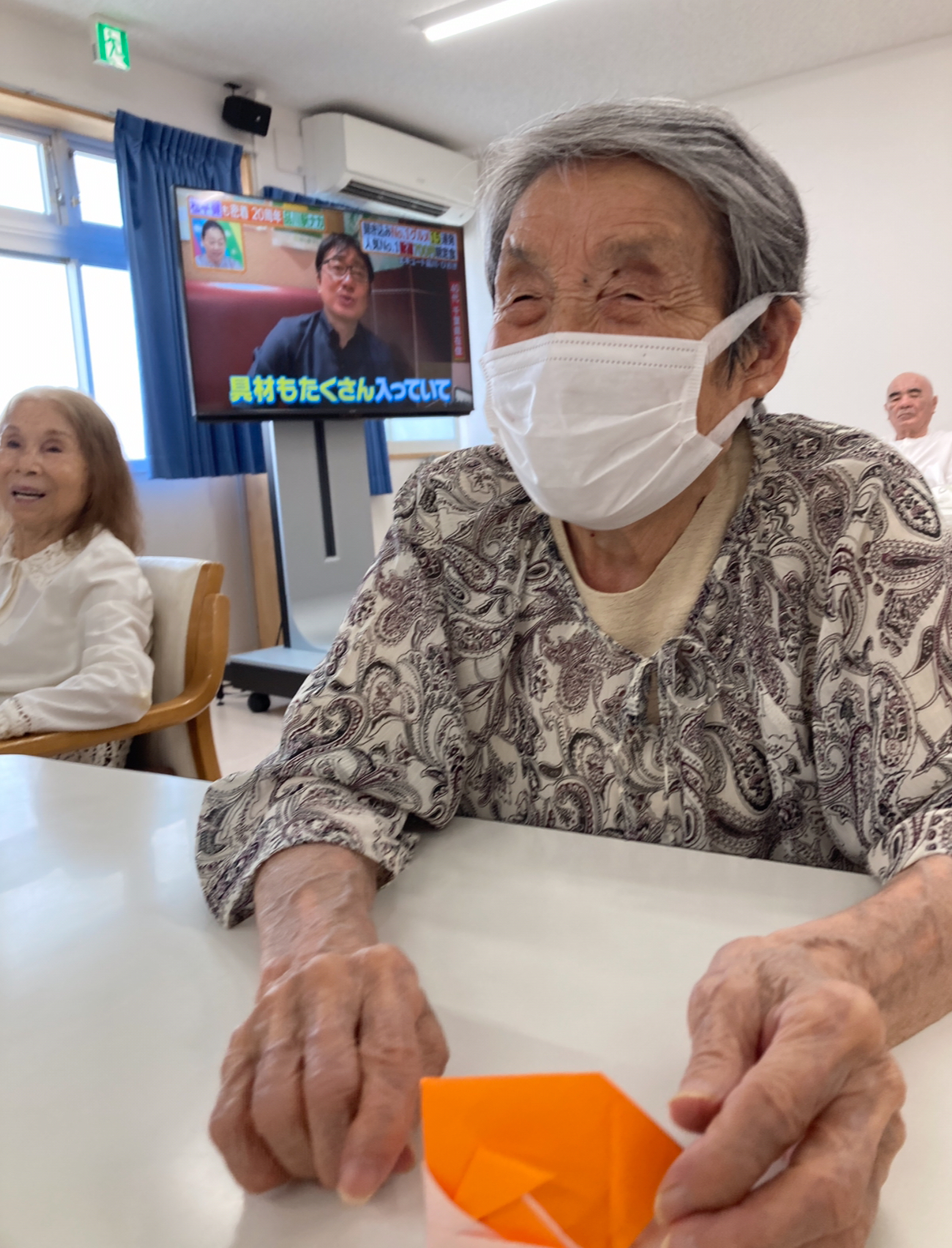 皆様こんにちは。枝川高齢者在宅サービスセンターです。お昼を食べ終えてM様が折り紙で金魚を折っています。「ここの部分わからないのよね〜」とこぼすM様。折り紙って簡単な様で深いですよね。私も次回までに折れる様練習してきます!