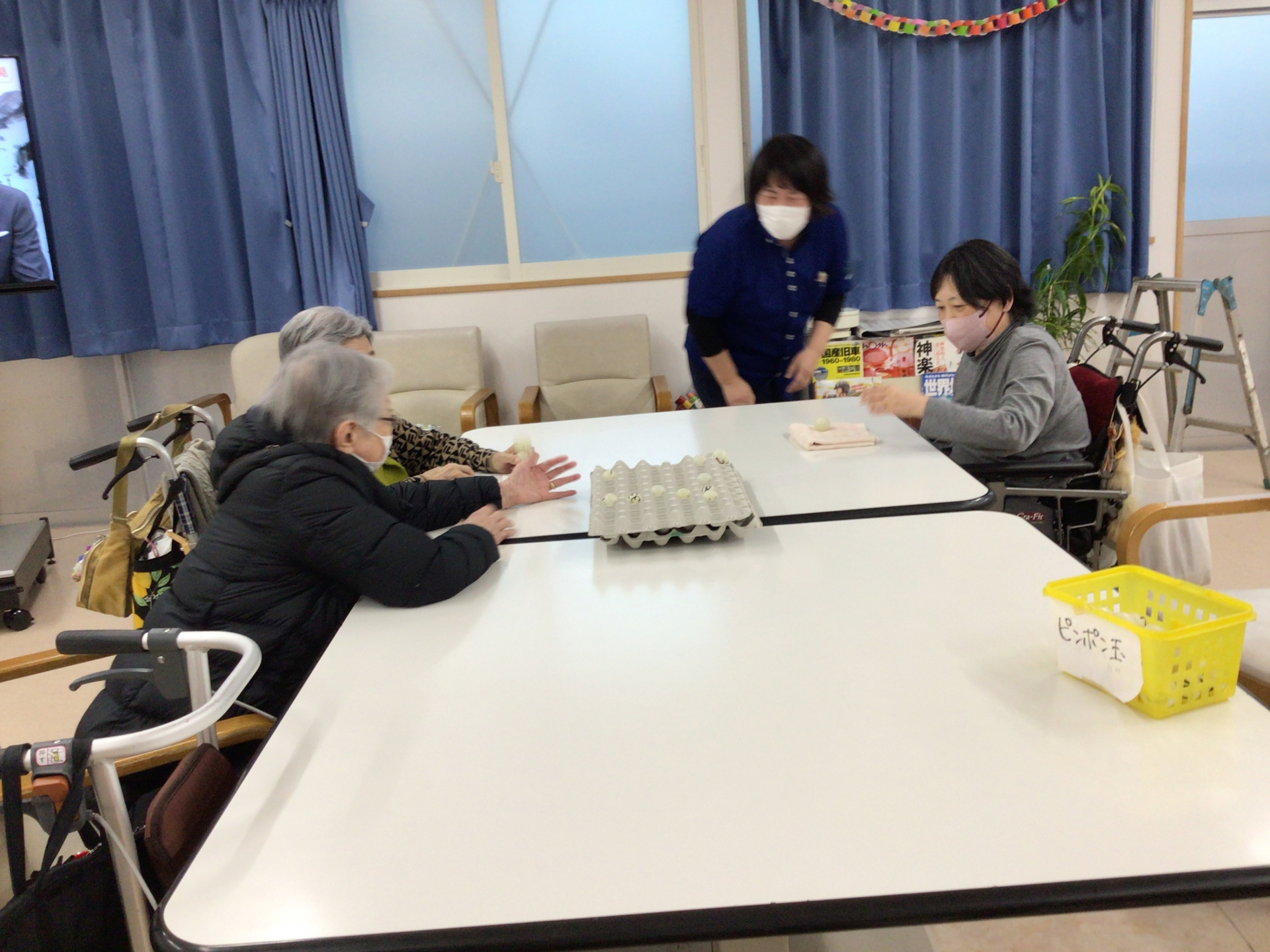 こんにちは。枝川高齢者在宅サービスセンターです。世の中には合いそうで合わなかったり、逆に合わなそうなのにぴったりなんていう事があります。今回のゲームは後者の方でたまごパックにピンポン玉がピッタリ収まるんです。しかし調べて見るとデイサービス的には結構有名みたいで。。。また一つ新しい発見をしました、というご報告でした。ゲーム的にはピンポン玉をテーブルに投げて、跳ね上がる勢いで指定されたたまごパックの場所に入れていくというゲーム。目で入れる場所を見てどれくらいの力加減でバウンドさせるかを決めるので感覚を掴むまで意外と大変だったり。派手さはありませんが、地味に感覚と身体の制御を連動させるので脳の活性化には持ってこいですね。(後でお迎えに上がったドライバーさんも混ざって遊んでました)