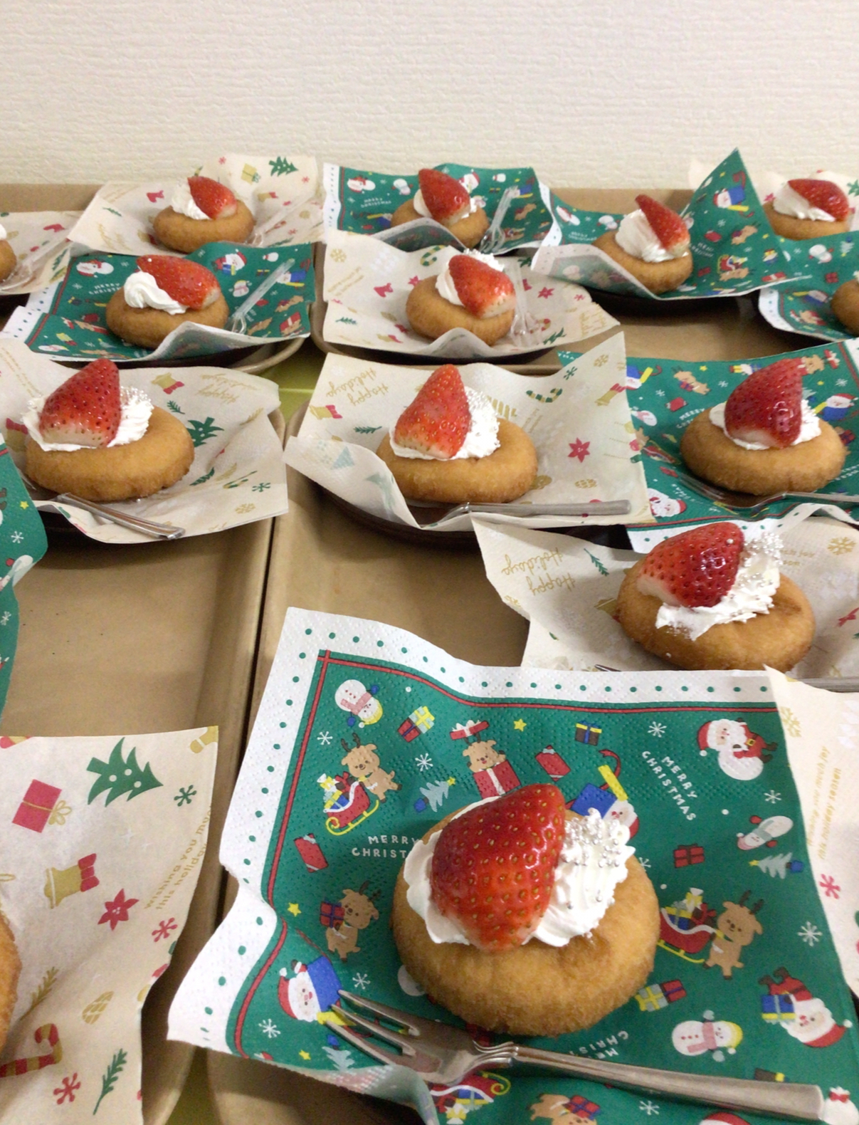 こんにちは。枝川高齢者在宅サービスセンターです。ここ20年で25日が雨の日は一度だけという珍しい雨のクリスマス2日目。あわてんぼうのサンタクロースとジングルベルを歌ってからビンゴ大会を行いました。おやつはドーナツの上にクリームとスライスしたいちごに銀砂糖をトッピング。いつもと少し違ったおやつに少しでも喜んで頂けたら幸いです。来年は新しい枝川でクリスマスを皆んなで楽しみましょう!