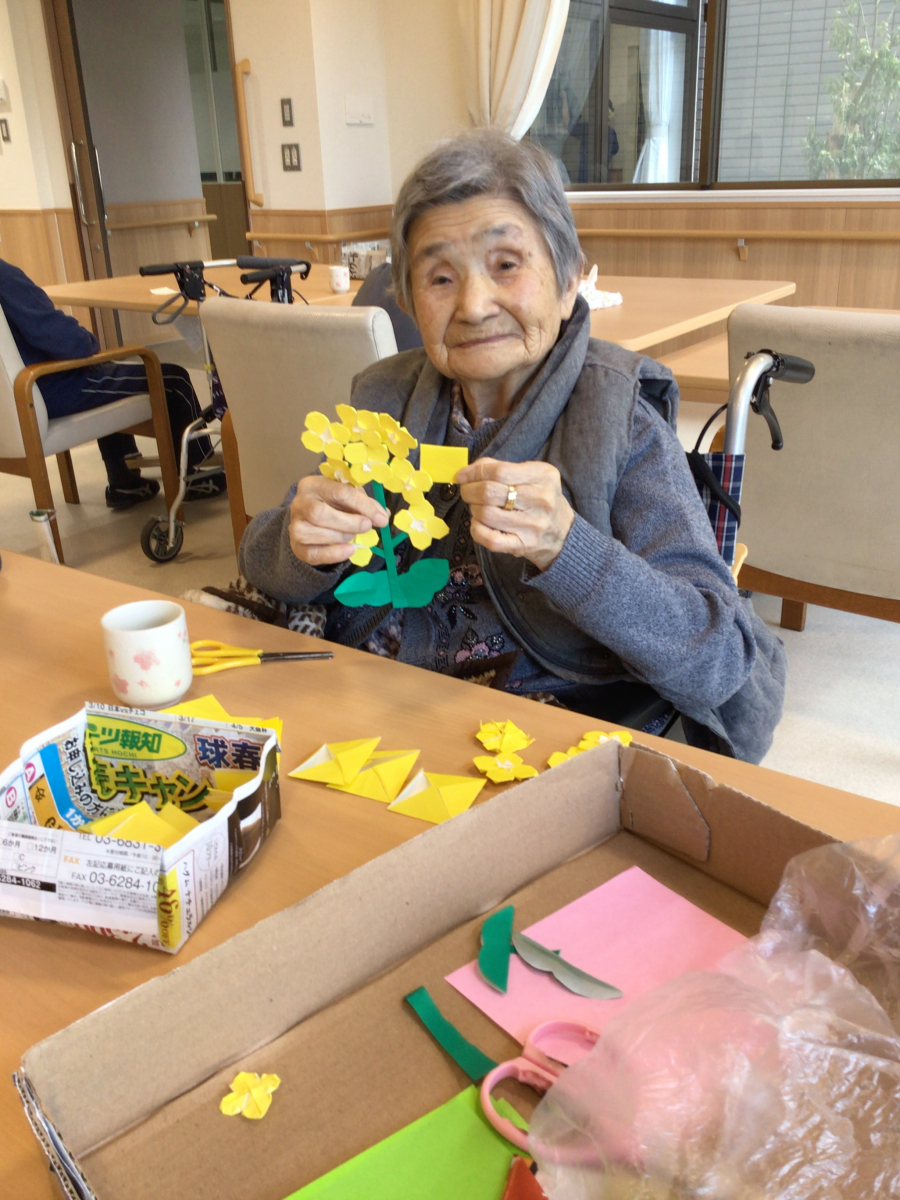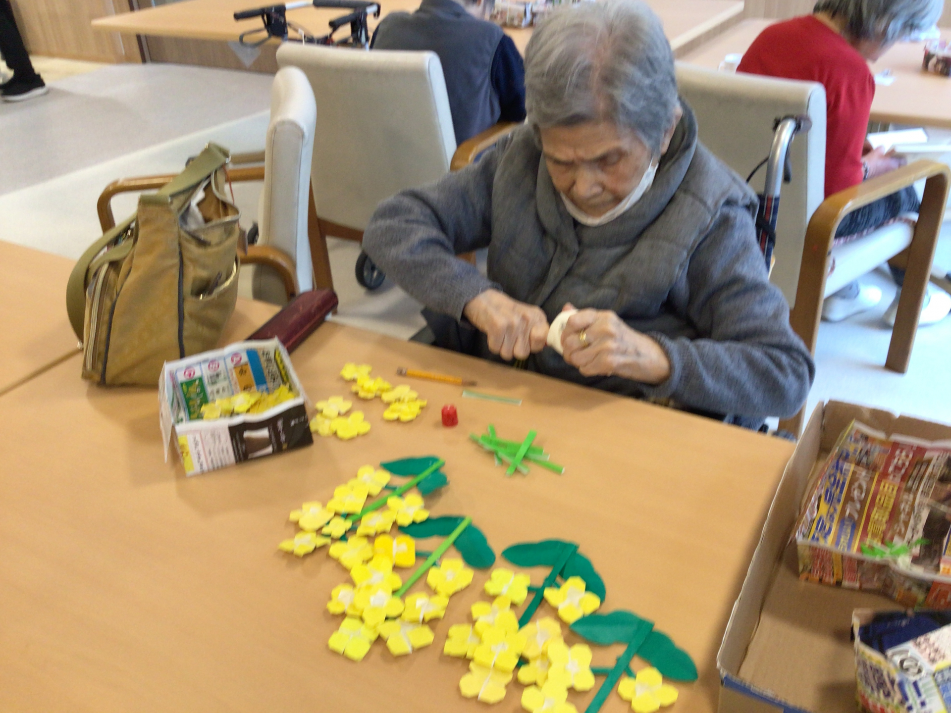 皆様、こんにちは。本日、デイに、またM職員と利用様で、何かの花を作っています!菜の花みたいです ^_^ 楽しそうですね。