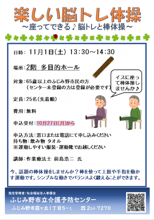2025.10.27 朝のぴんしゃん体操~インフルエンザやのど風邪が増えています!~ 活動報告 2025.10.25 スマホ講座「スマートフォンの基本操作+自然災害時に役立つアプリ等」 お知らせ 2025.10.25 楽しい脳トレ体操のお知らせ お知らせ 2025.10.25 「健康太極拳」を開催いたしました! 活動報告 #ふじみ野市立介護予防センター #健康太極拳 2025.10.25 スマホ悩み相談室 活動報告 2025.10.24 モルックで遊ぼう! 活動報告 2025.10.24 菜園ボランティア 畑と花壇の片付けをしました。 活動報告 #ふじみ野市立介護予防センター #菜園ボランティア 2025.10.24 朝ぴんしゃん体操 活動報告 2025.10.24 『写経の会』開催しました! 活動報告 2025.10.23 空手ビクス 活動報告 2025.10.22 「ふじみん介護予防手帳の使用方法と目的の講座」を開催しました! 活動報告 2025.10.21 スローエアロビック♪ 活動報告 #ふじみ野市立介護予防センター #スローエアロビック 2025.10.20 モルックで遊ぼう!お知らせ お知らせ 2025.10.20 モルックで遊ぼう!開催しました 活動報告 2025.10.20 スポーツ吹き矢を開催しました! 活動報告 #ふじみ野市立介護予防センター #スポーツ吹矢 1 … 6 7 8 9 10 … 76