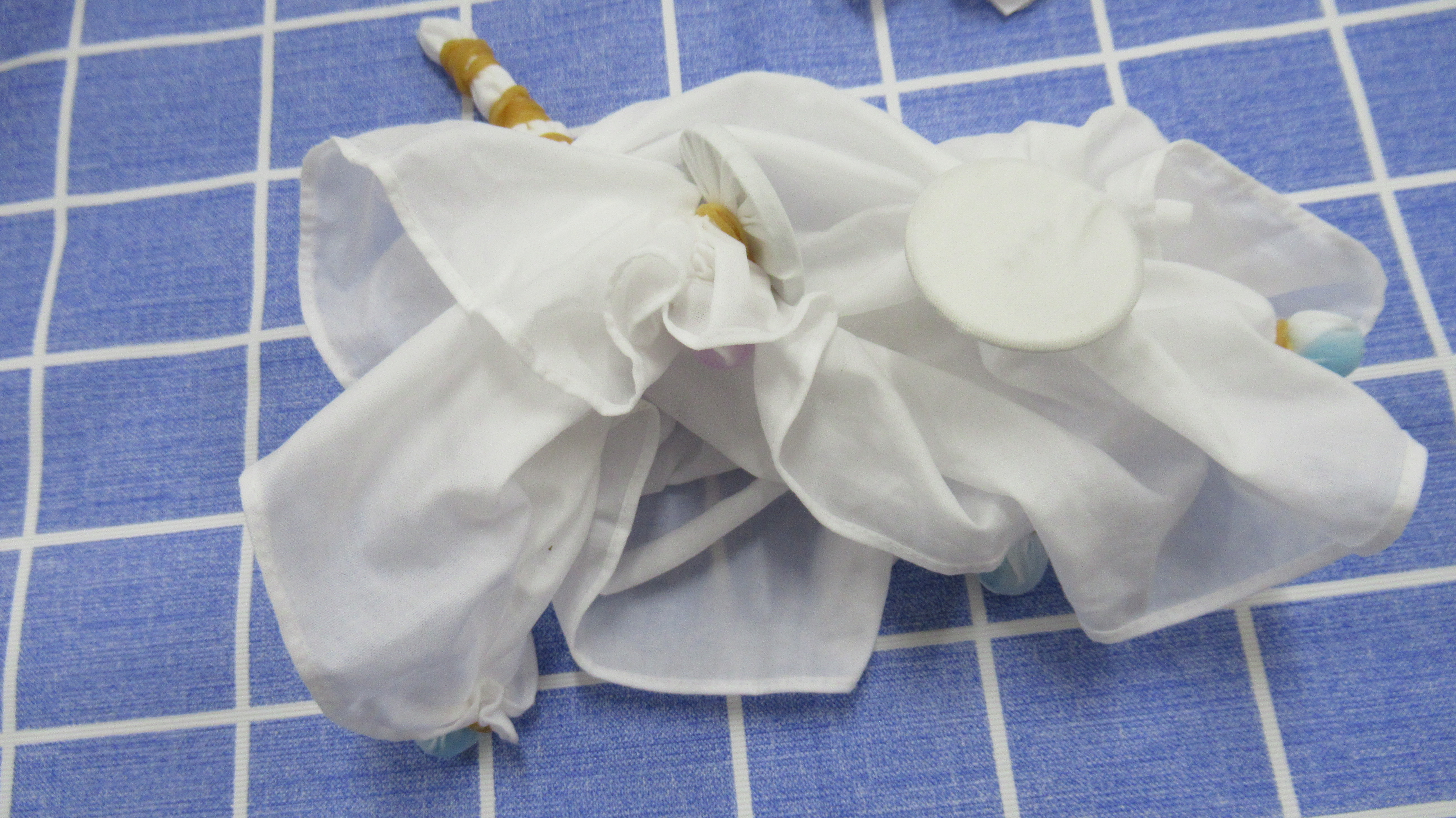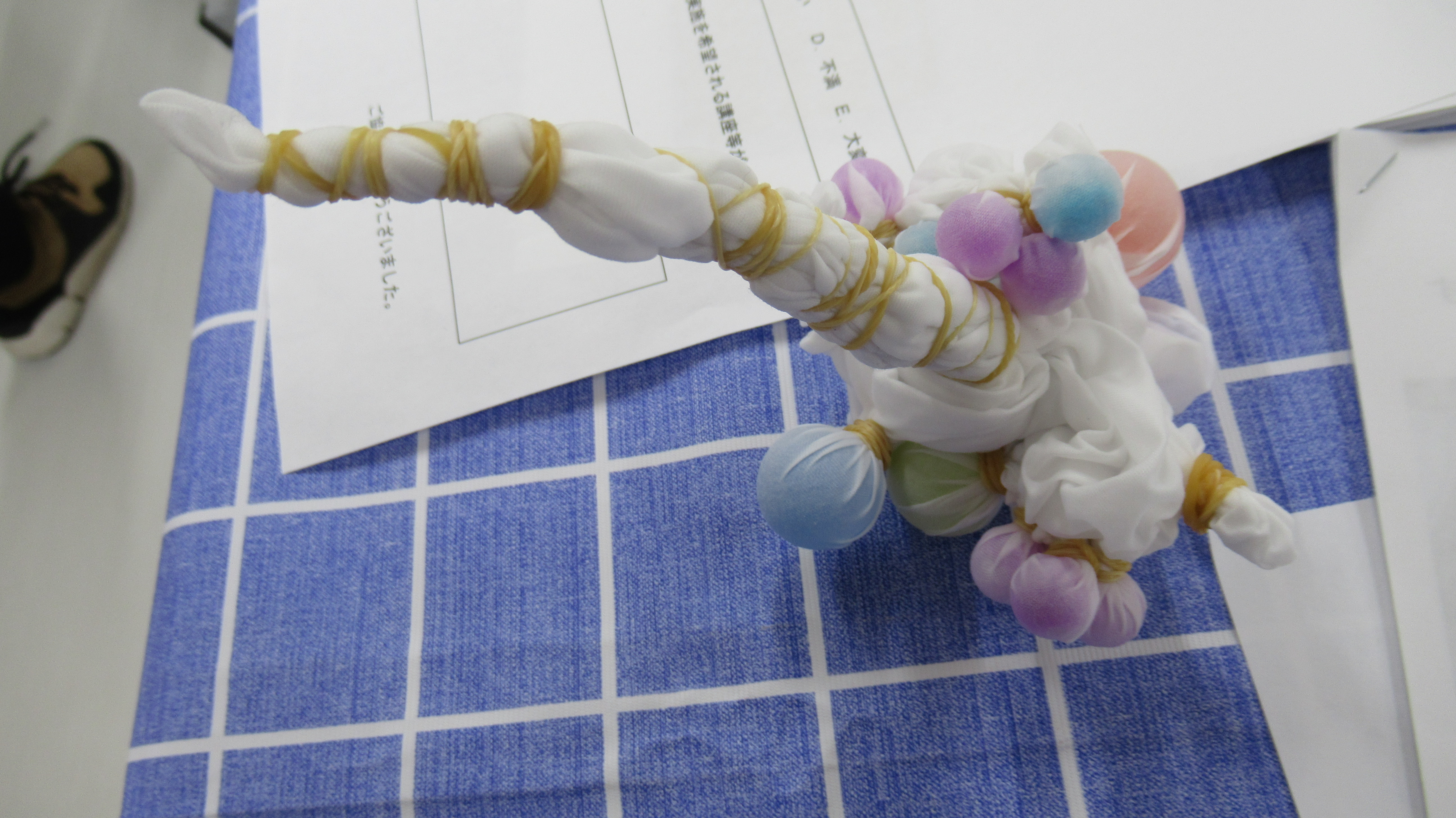 皆さんハンカチに割りばしやスーパーボール、ペットボトルキャップ、ボタンで、絞り模様を作ります。