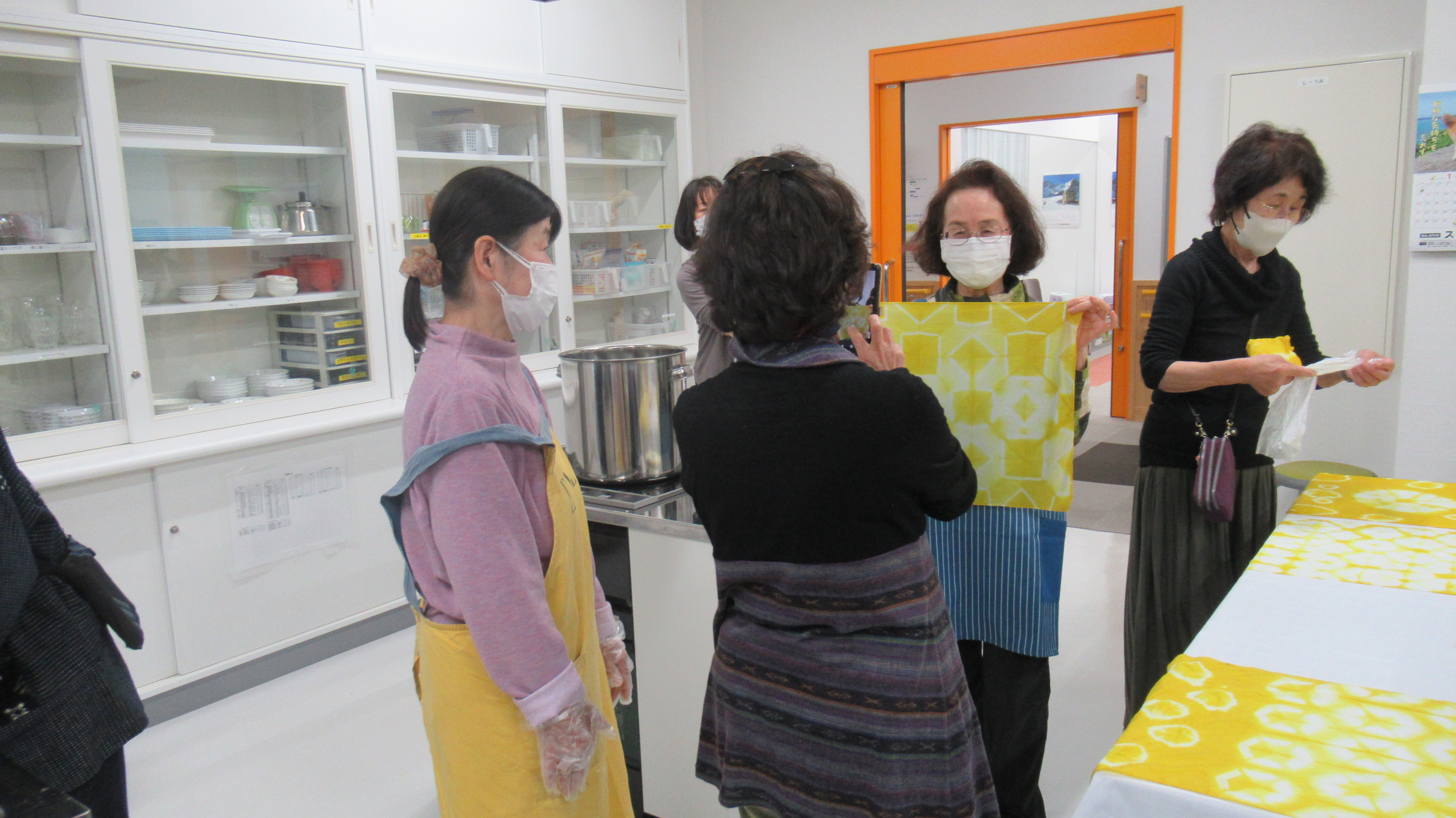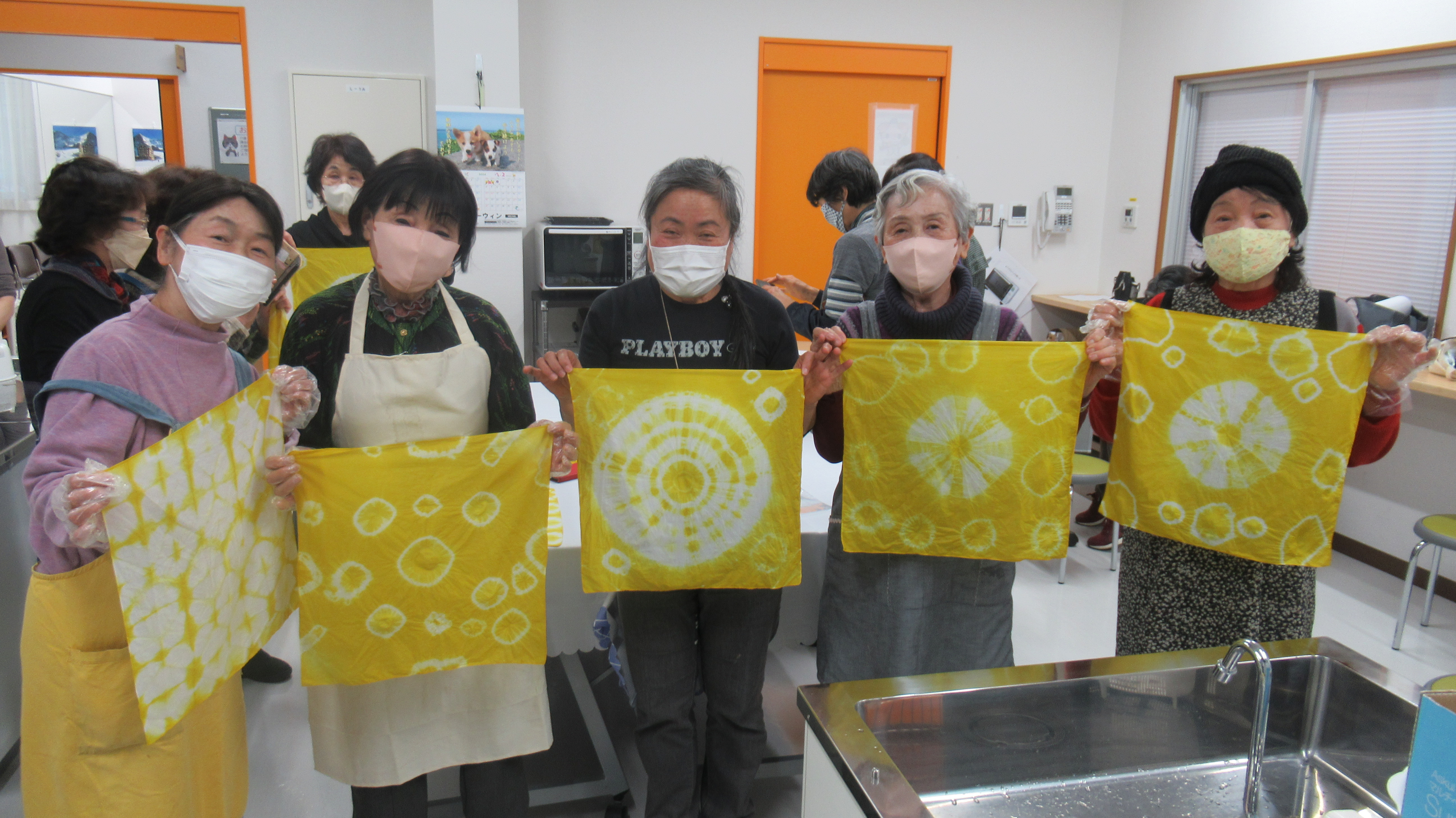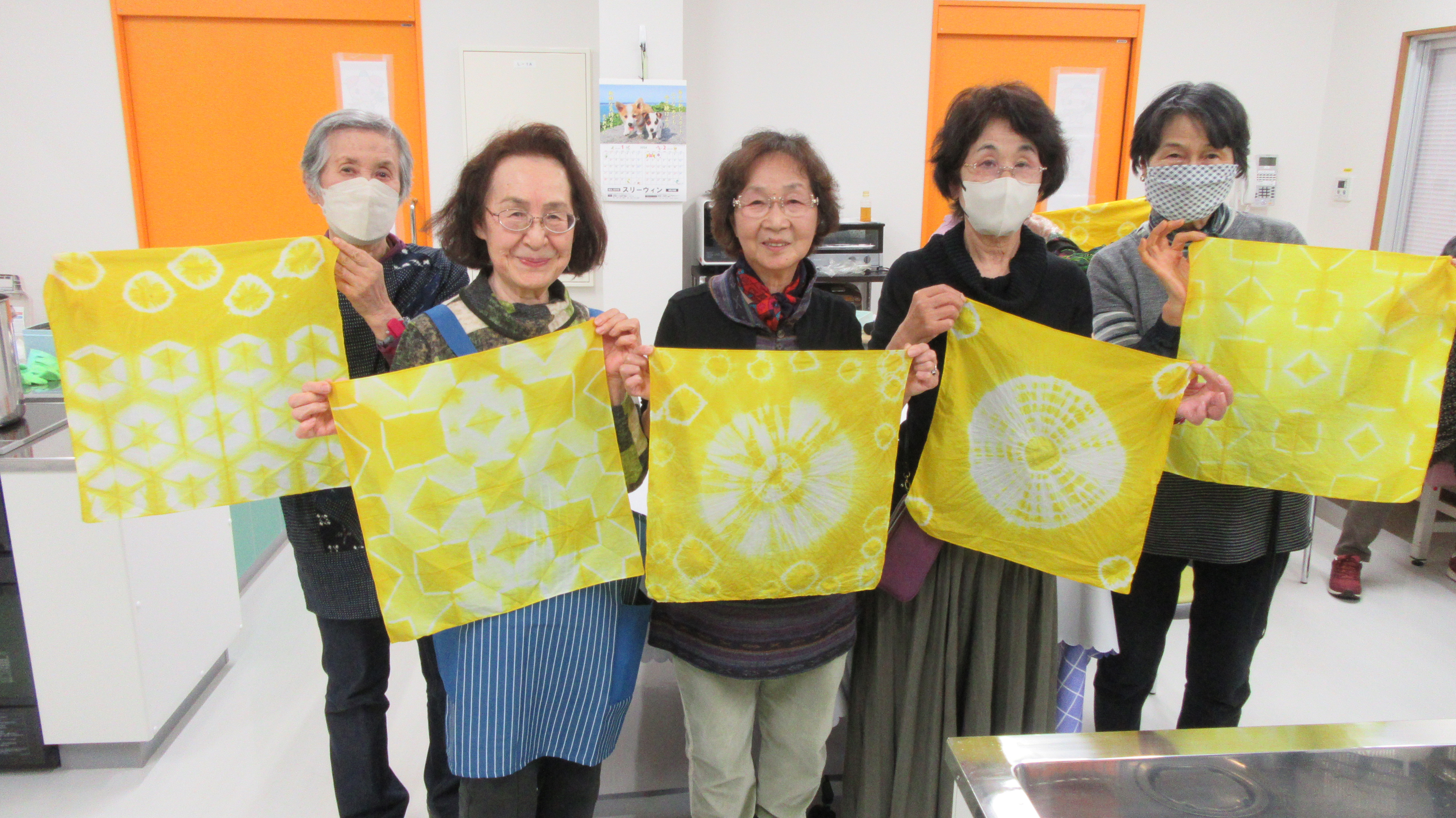 今日は、夏にセンターの花壇で育てたマリーゴールドで、ハンカチの絞り染めをしました。