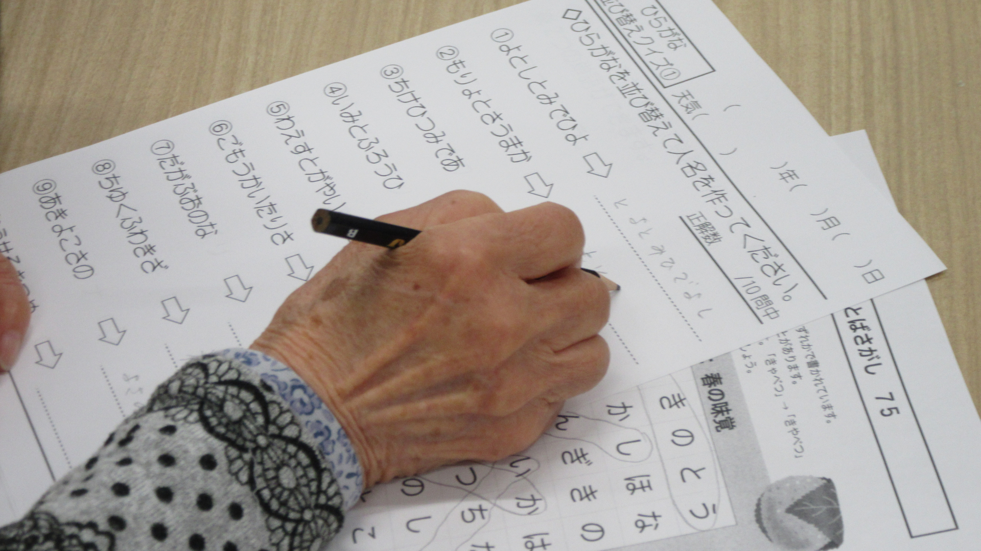 計算の問題、ひらがな並び替え、図形を使った問題、時計の問題と