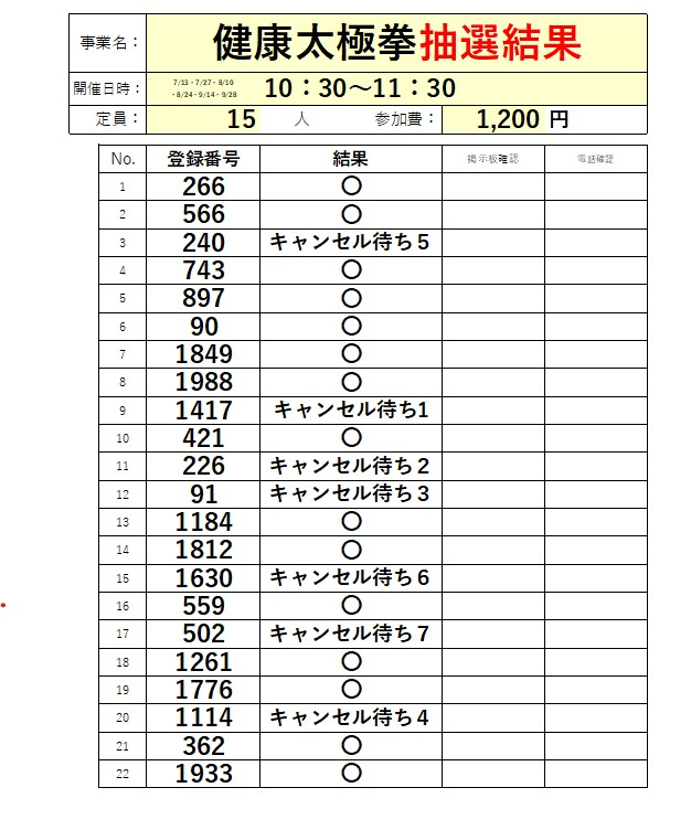 2024.07.05 活動報告 健康太極拳 7月 抽選結果発表 Tweet シェアする 健康太極拳 7月 抽選結果発表 前の記事 2024.07.05 活動報告 菜園ボランティアさんによる「ジャガイモ販売」実施しました(^^♪ 次の記事 2024.07.04 活動報告 「ヨガ教室」7月コーススタートしました! 一覧へ戻る