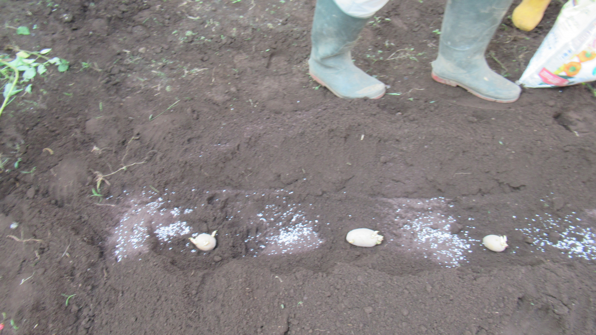 耕運機で耕して、3つの畝にじゃがいもの種芋を均等においてから、肥料をいれます。