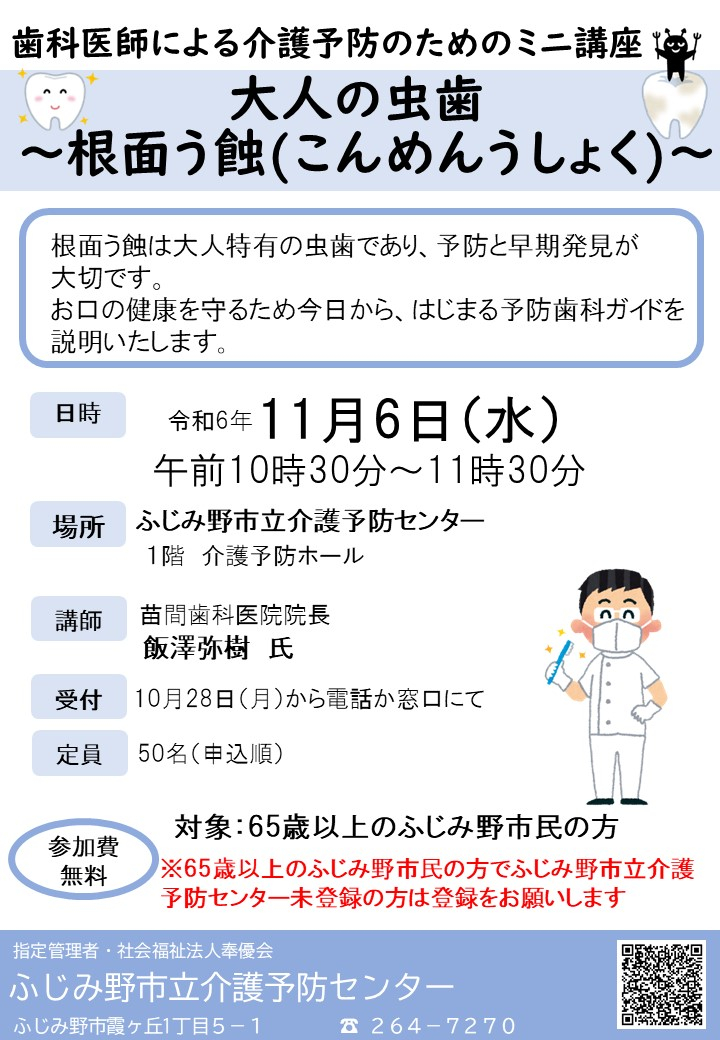 2024.10.29 お知らせ ミニ講座「大人の虫歯~根面う触(こんめんうしょく)」~ Tweet シェアする 11月6日(水)に、 ミニ講座「大人の虫歯~根面う触(こんめんうしょく)」~を開催いたします。 ふじみ野市立介護予防センター H.I 前の記事 2024.10.29 お知らせ クリスマス装飾 ~装飾ボランティア募集~ 次の記事 2024.10.29 お知らせ 11月の体力測定会 一覧へ戻る