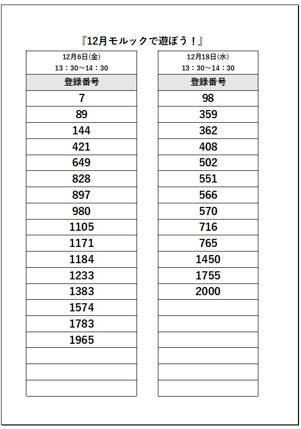 2024.11.29 お知らせ 12月の『モルックで遊ぼう!』 Tweet シェアする 12月の『モルックで遊ぼう!』の抽選結果です。 両日とも、空きがありますので参加をご希望される方は、直接お申し込みください。 ふじみ野市立介護予防センター N.K 前の記事 2024.11.29 お知らせ 自主グループ『楽食会』蕎麦打ちしました。 次の記事 2024.11.29 お知らせ ぴんしゃん体操のお手本をしてくださる方を募集しています。<シニア向けボランティアコーディネートサイト エール> 一覧へ戻る