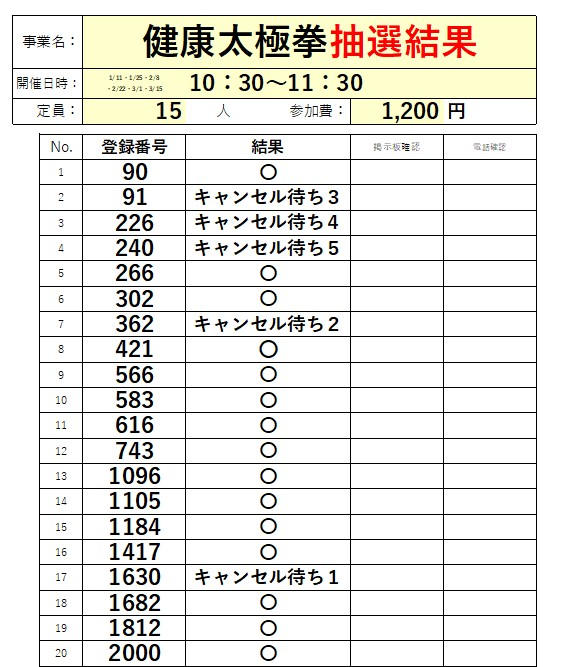 センター事務所前の掲示板にも、抽選結果が掲示してありますので、確認しましたら確認欄にチェックをお願いします。