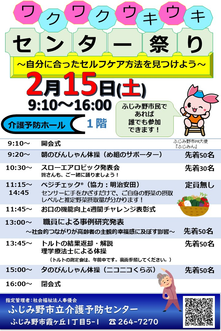 今回のワクワクウキウキセンター祭りでも、介護予防に特化した15の講座とイベントを準備しています。