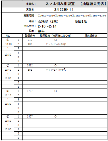 本日は、抽選結果の発表をいたします。下記の通りになります。