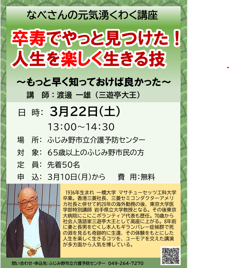 ふじみ野市立介護予防センターでは、3月22日(土)13:00より『なべさんの元気湧くわく講座』を開催いたします。