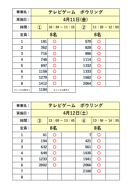 4月「テレビゲームボウリング」の抽選結果発表です。