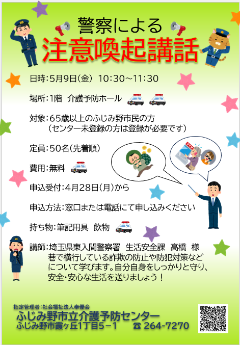 5月9日(金)、ふじみ野市立介護予防センターにて、「警察による注意喚起講話」を開催します。