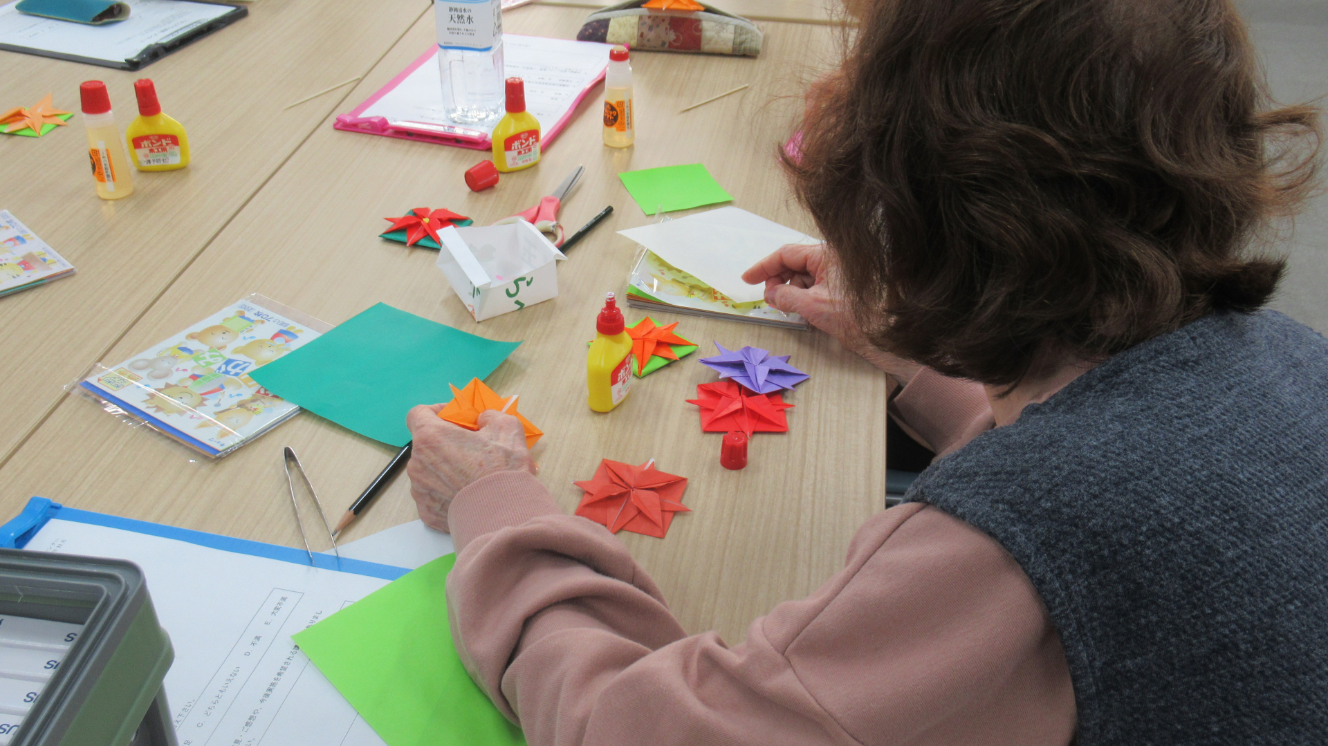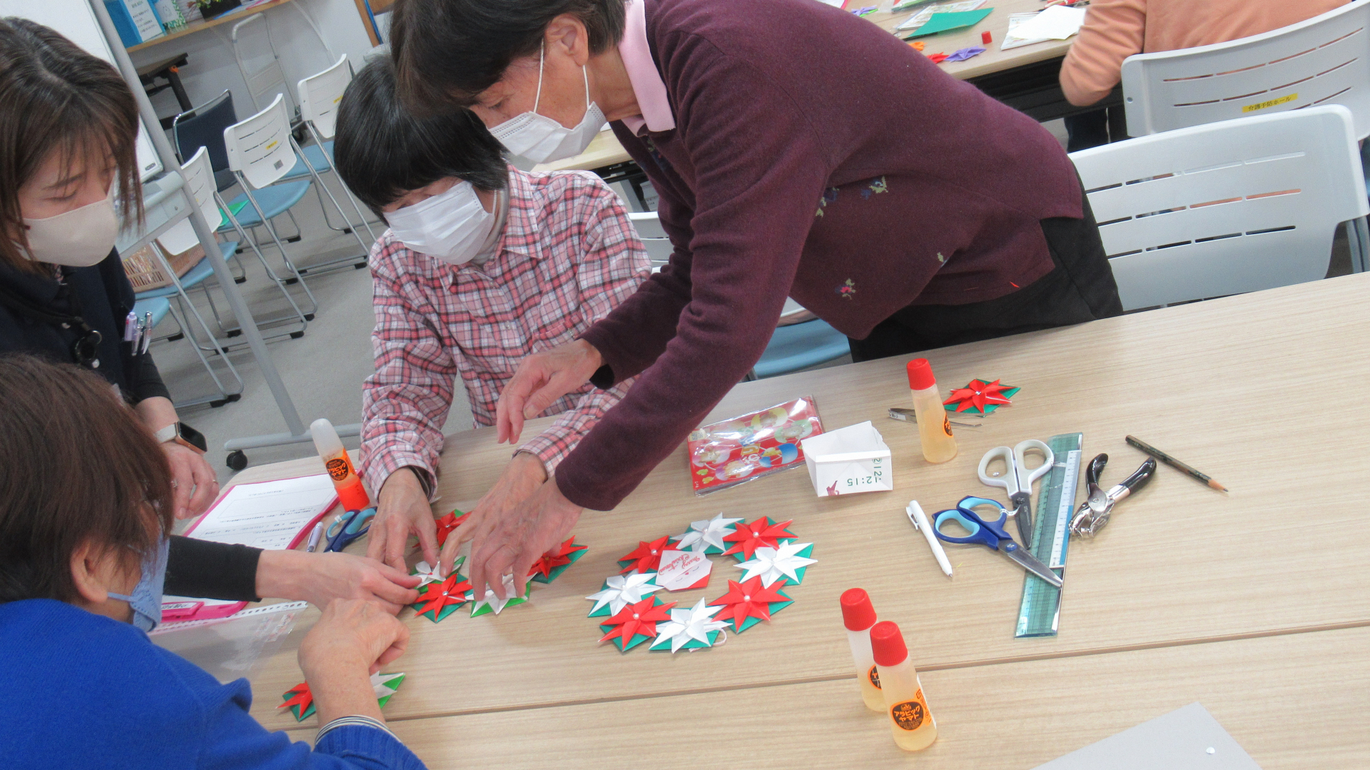 続いて、ポインセチアのリース作りです。細かな折り作業が難しかったです。