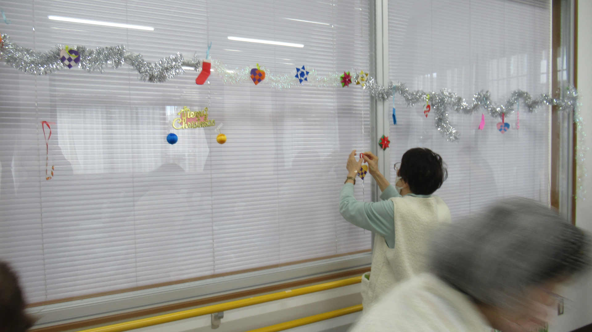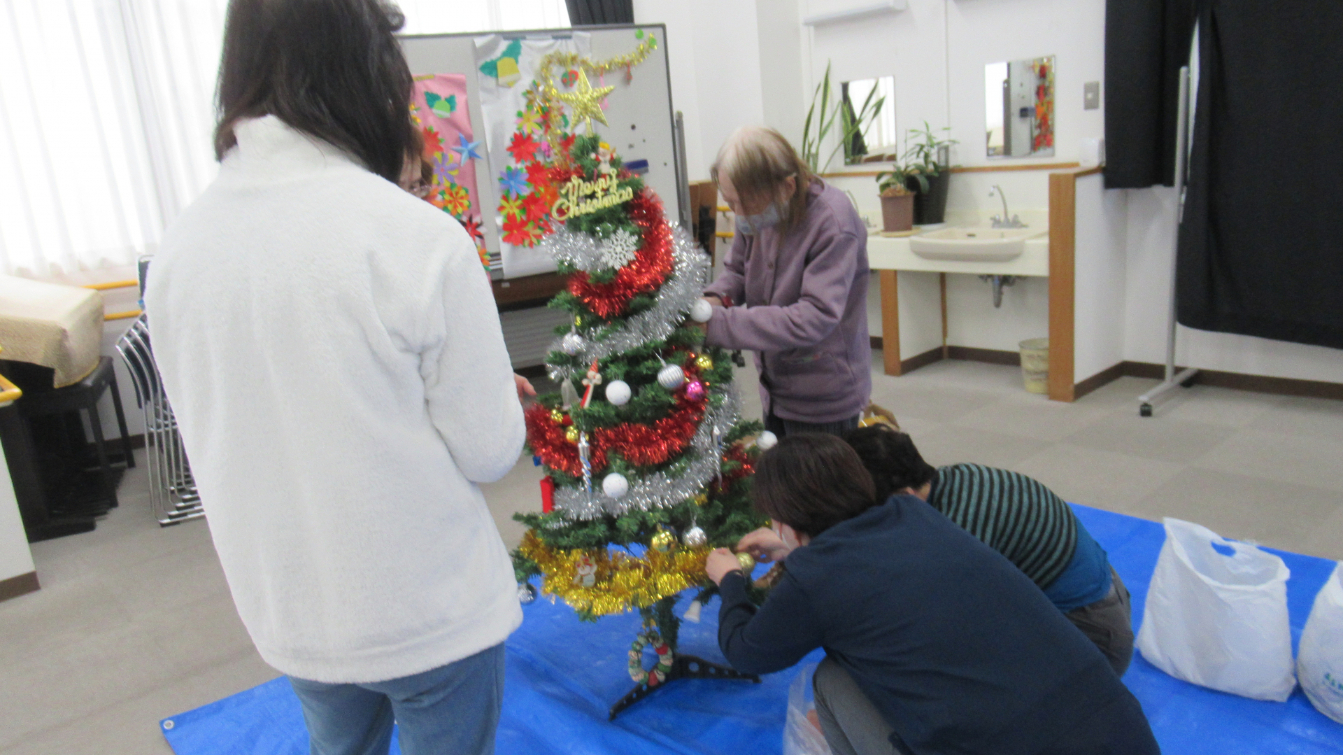 3回ある中の…本日は、第3回目です。クリスマスツリーの飾りつけと介護予防ホールの壁面の飾りつけを行いました!