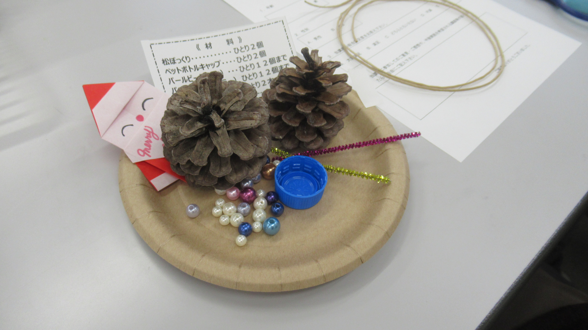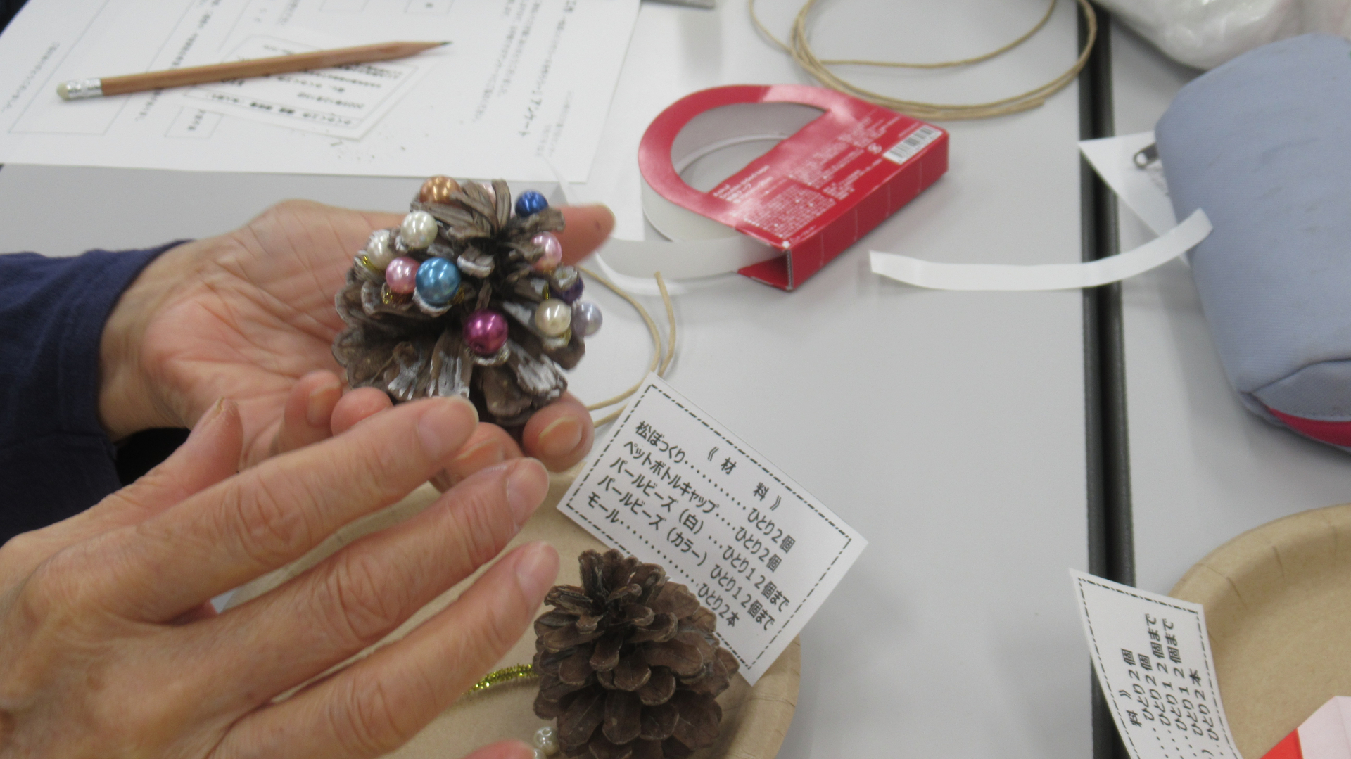 ふじみ野市立介護予防センターでは、ワクワク工作「松ぼっくりでクリスマスツリー」を作りました。