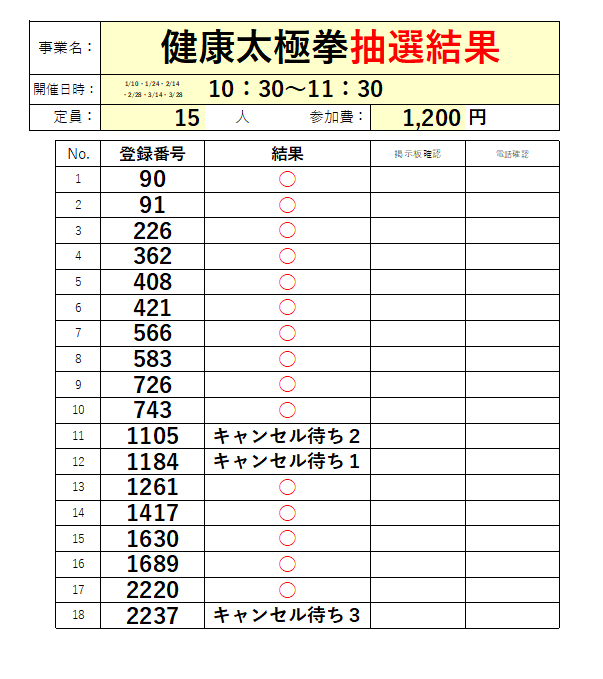 2026年1月~3月「健康太極拳」の抽選結果発表です!
