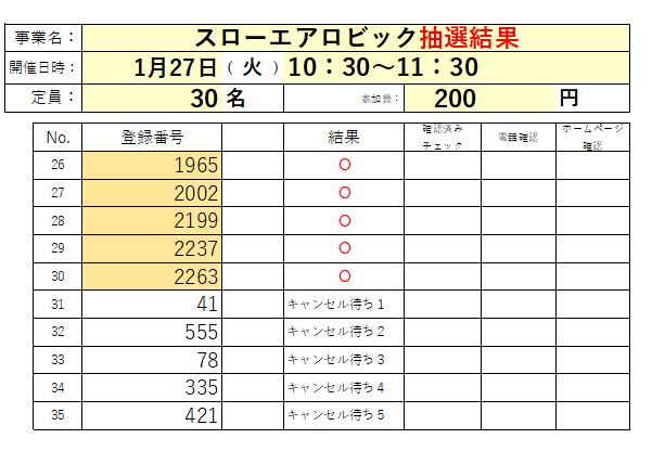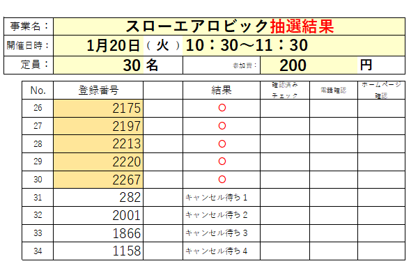 1月「スローエアロビック」の抽選結果です。