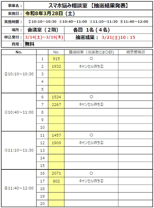 『スマホ悩み相談室』 抽選結果発表をいたします。