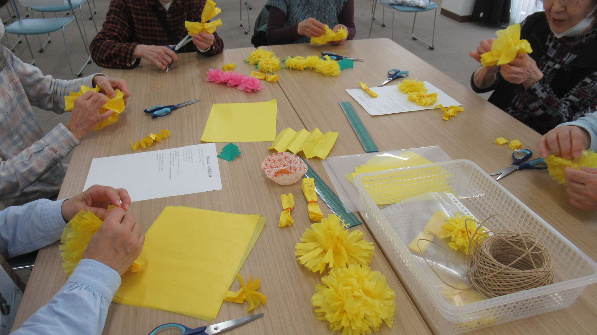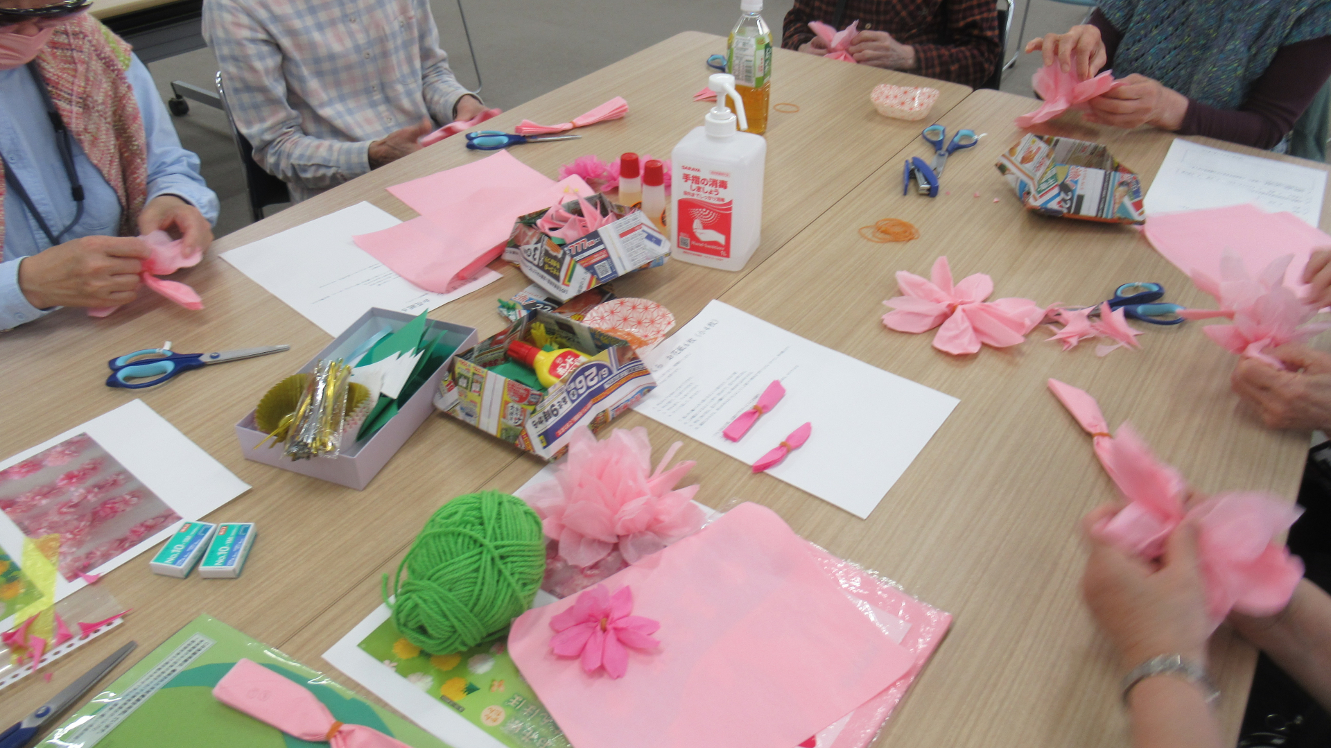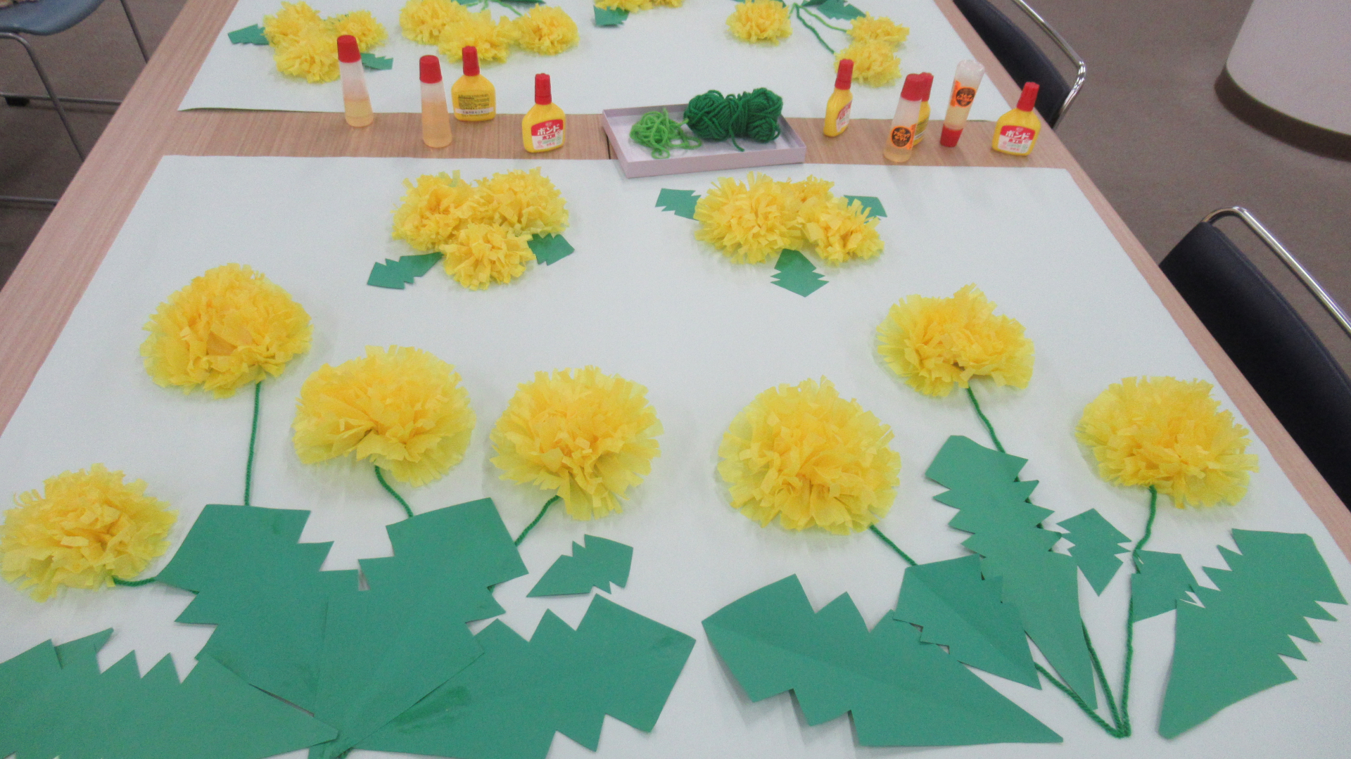 たんぽぽと八重桜をお花紙で作りました。これがなかなか難しい。