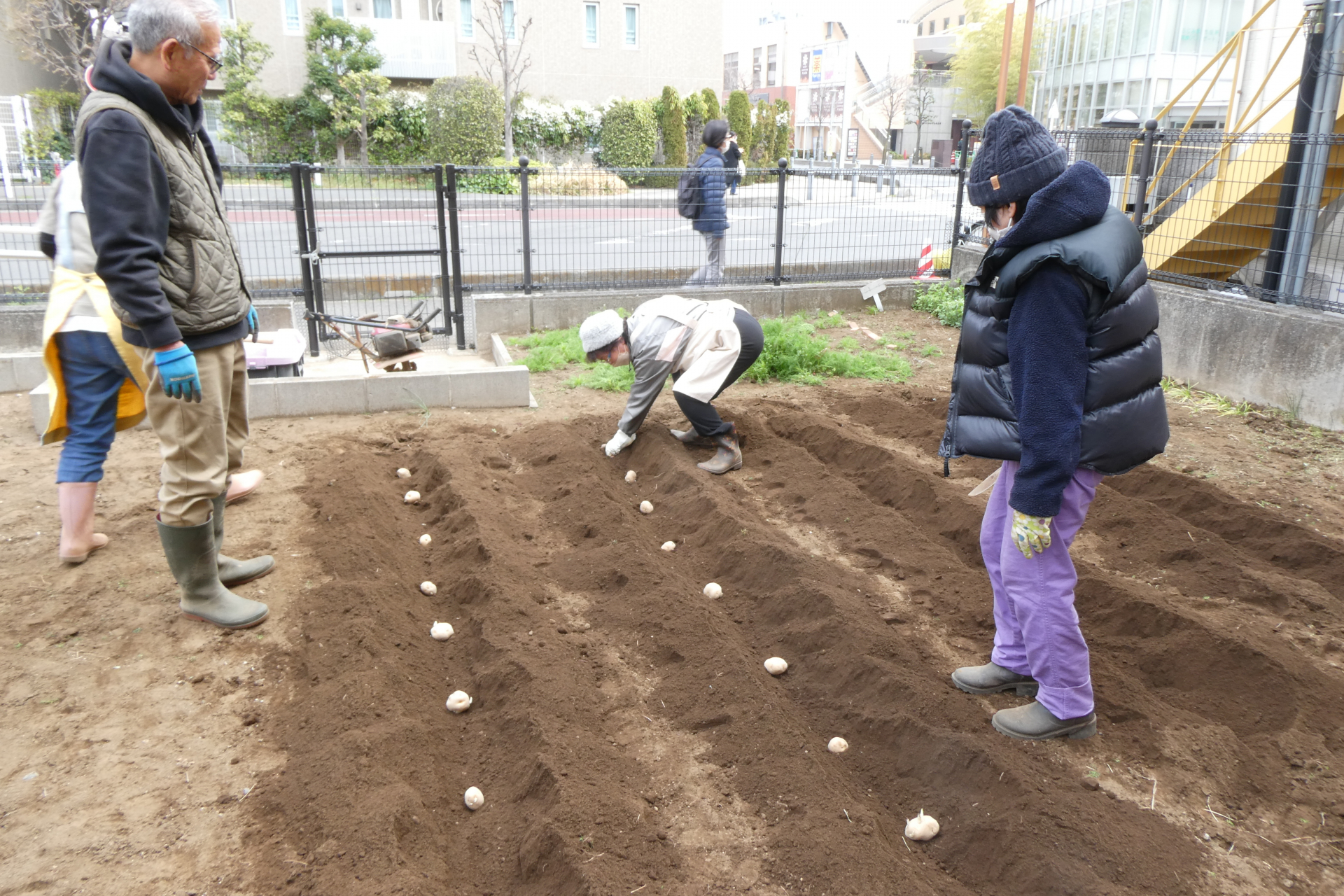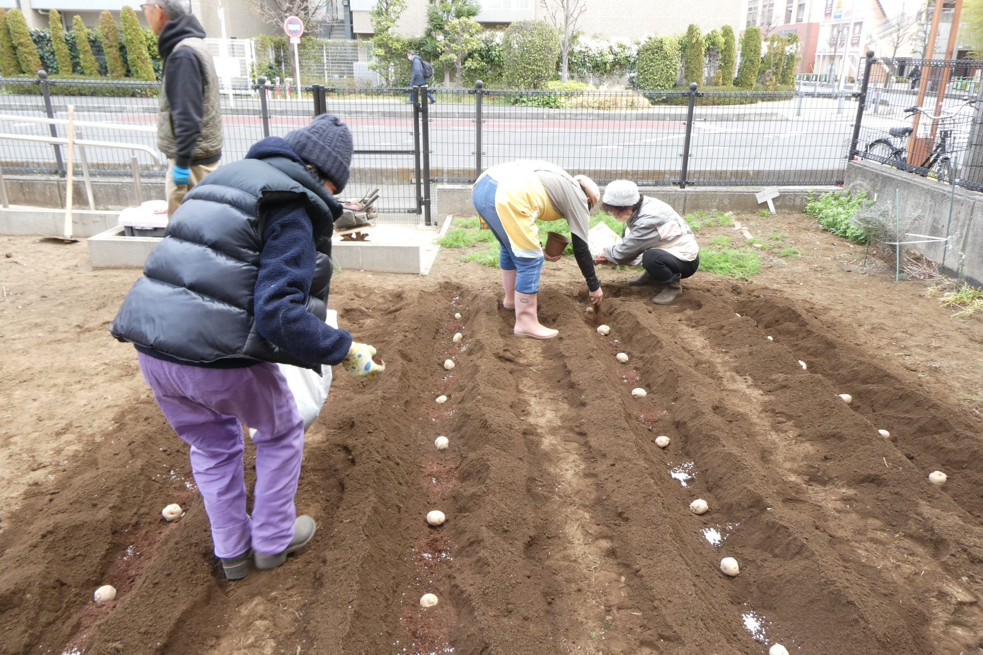 種芋を均等に置き、化成肥料と牛糞を入れて上から土を被せていきます! どの種芋もすくすく成長することを願って・・・