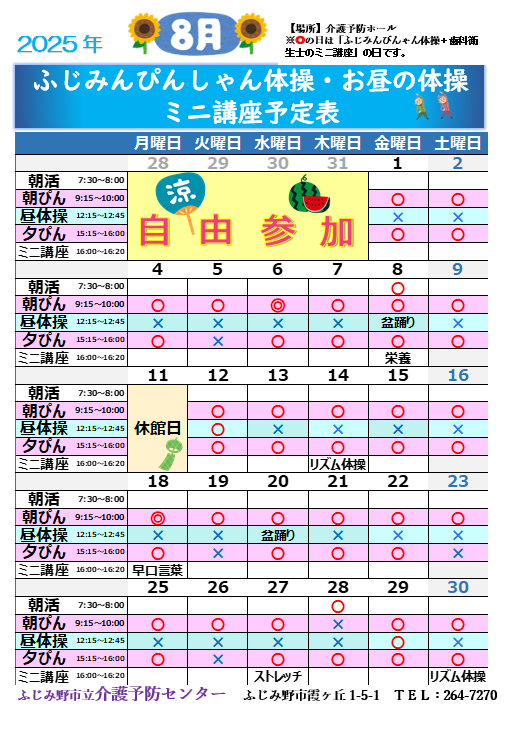 2025.07.25 お知らせ 令和7年8月 朝活・ふじみんぴんしゃん体操・お昼の体操・ミニ講座予定表 Tweet シェアする 令和7年8月 朝活・ふじみんぴんしゃん体操・お昼の体操・ミニ講座予定表 一覧へ戻る