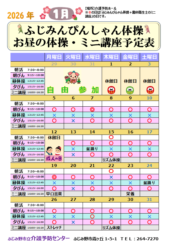2025.12.25 お知らせ 令和8年1月 朝活・ふじみんぴんしゃん体操・お昼の体操・ミニ講座予定表 Tweet シェアする 令和8年1月 朝活・ふじみんぴんしゃん体操・お昼の体操・ミニ講座予定表 一覧へ戻る
