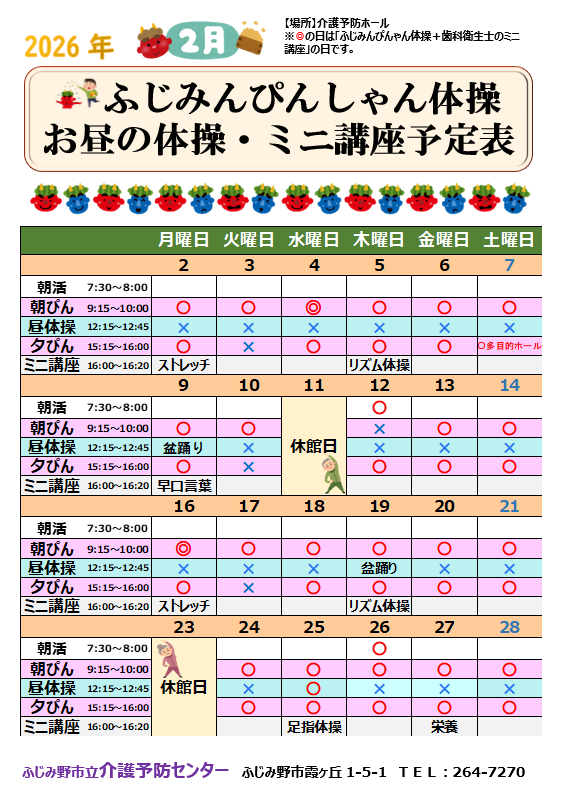 2026.01.26 お知らせ 令和8年2月 朝活・ふじみんぴんしゃん体操・お昼の体操・ミニ講座予定表 Tweet シェアする 令和8年2月 朝活・ふじみんぴんしゃん体操・お昼の体操・ミニ講座予定表 一覧へ戻る