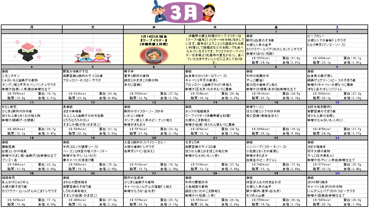 2024.02.29 お知らせ 【花の木デイ】来月の献立表です。 Tweet シェアする こんにちは。まだまだ寒い今日この頃ですが、美味しい春野菜が出始めましたね。 来月も、工夫を凝らしたメニューをご用意し、皆様のお越しをお待ちしております。 担当:大里 #デイサービス #花の木デイ #3月 #献立表 前の記事 2024.02.29 お知らせ 【花の木デイ】3月の活動予定表です。 次の記事 2024.02.24 お知らせ 【花の木デイ】新しい事、始めています(^^♪ 一覧へ戻る