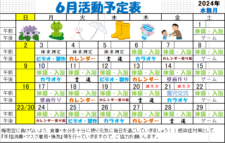 2024.06.01 お知らせ 【花の木デイ】6月の活動表 Tweet シェアする 今月の活動表になります。 入梅のころですが、雨に負けない様、職員一同元気よく、お待ちしております♪ 花の木デイ:O #デイサービス #奉優会 #花の木デイ 前の記事 2024.06.01 お知らせ 【花の木デイ】今月の献立表 次の記事 2024.06.01 お知らせ 【花の木デイ】花の木通信6月号 一覧へ戻る