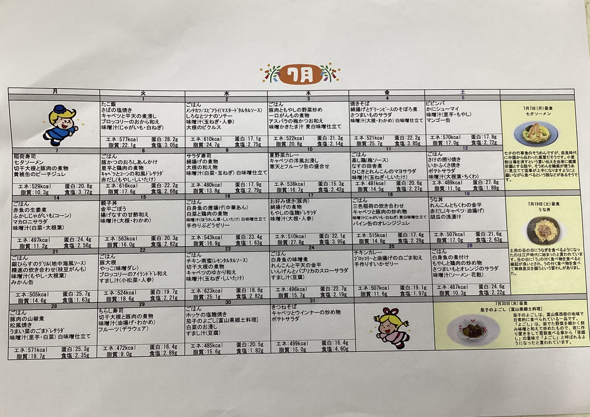 今月は7日に七夕ソーメン、19日にうな丼、30日に富山県の郷土料理那須のよごしが提供予定となっております。